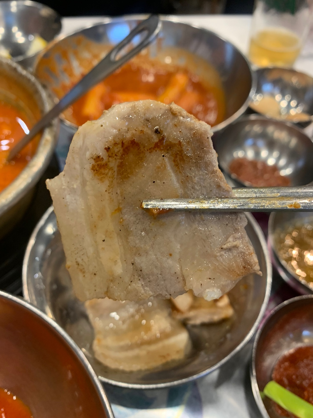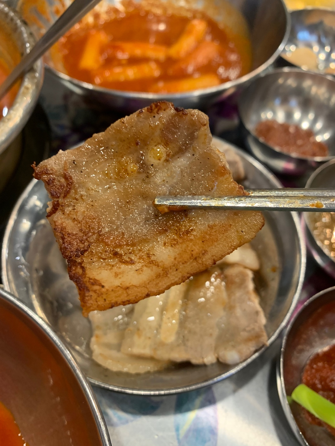 보통 우리네 저렴한 냉동삼겹살엔 기대하긴 힘든 밑반찬 한 상입니다! 불필요한 구성 없이 하나하나 맛있고, 특히 기대도 안 했던 떡볶이 미쳤어요. 또 먹고 싶다!