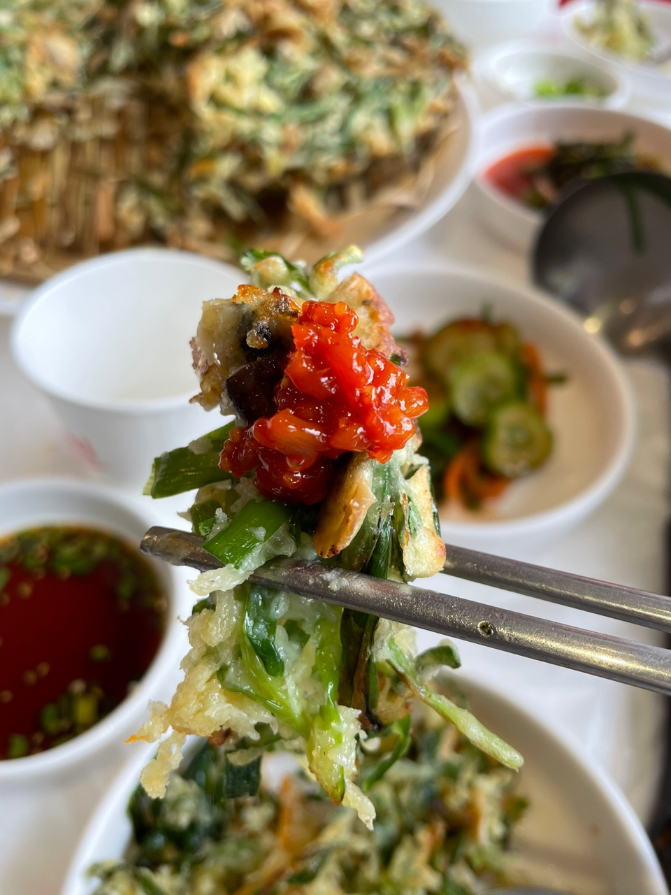 딱 보기에도 맛있죠? 바삭하면서도 파의 결이 모두 살아있고, 생각보다 밀가루가 적게 들어가있어서 덜 느끼하면서도, 더 몸에 좋은 그런 느낌! 절임 양파와 함께 먹는 것도 일품이지만, 밑반찬 중 하나인 식해와 먹으면 꿀맛이에요.