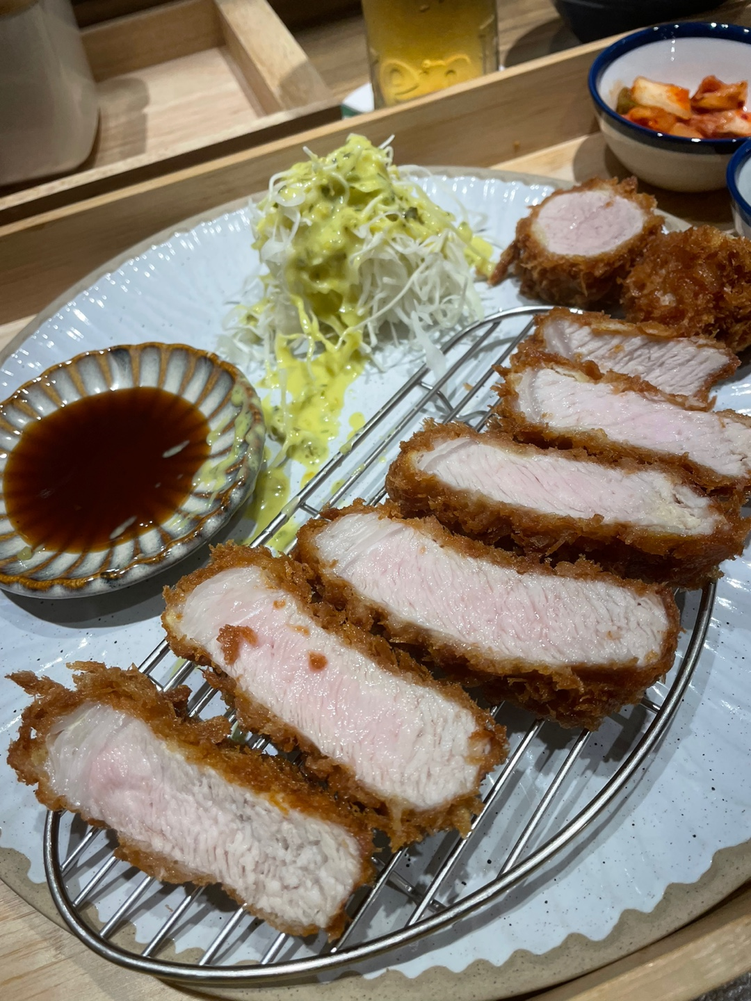기다리다 보면 드디어 카츠가 나옵니다! 두구두구! 두툼한 카츠에 꽃게 향이 느껴지는 장국 그리고 돌판 위에 고추냉이와 트러플 소금이 세팅됩니다. 정녕 서창동에서 볼 수 있는 구성이란 말이더냐.