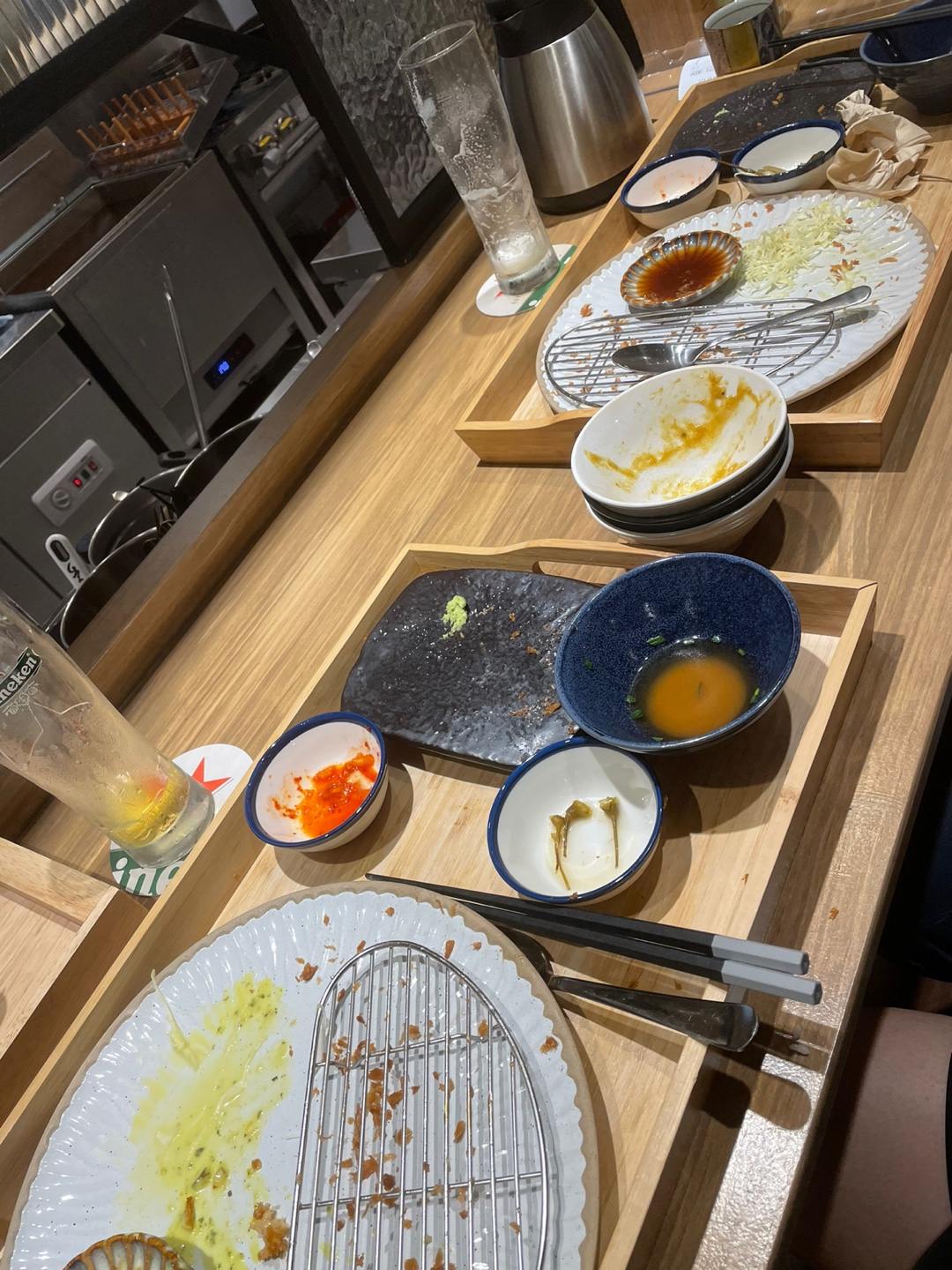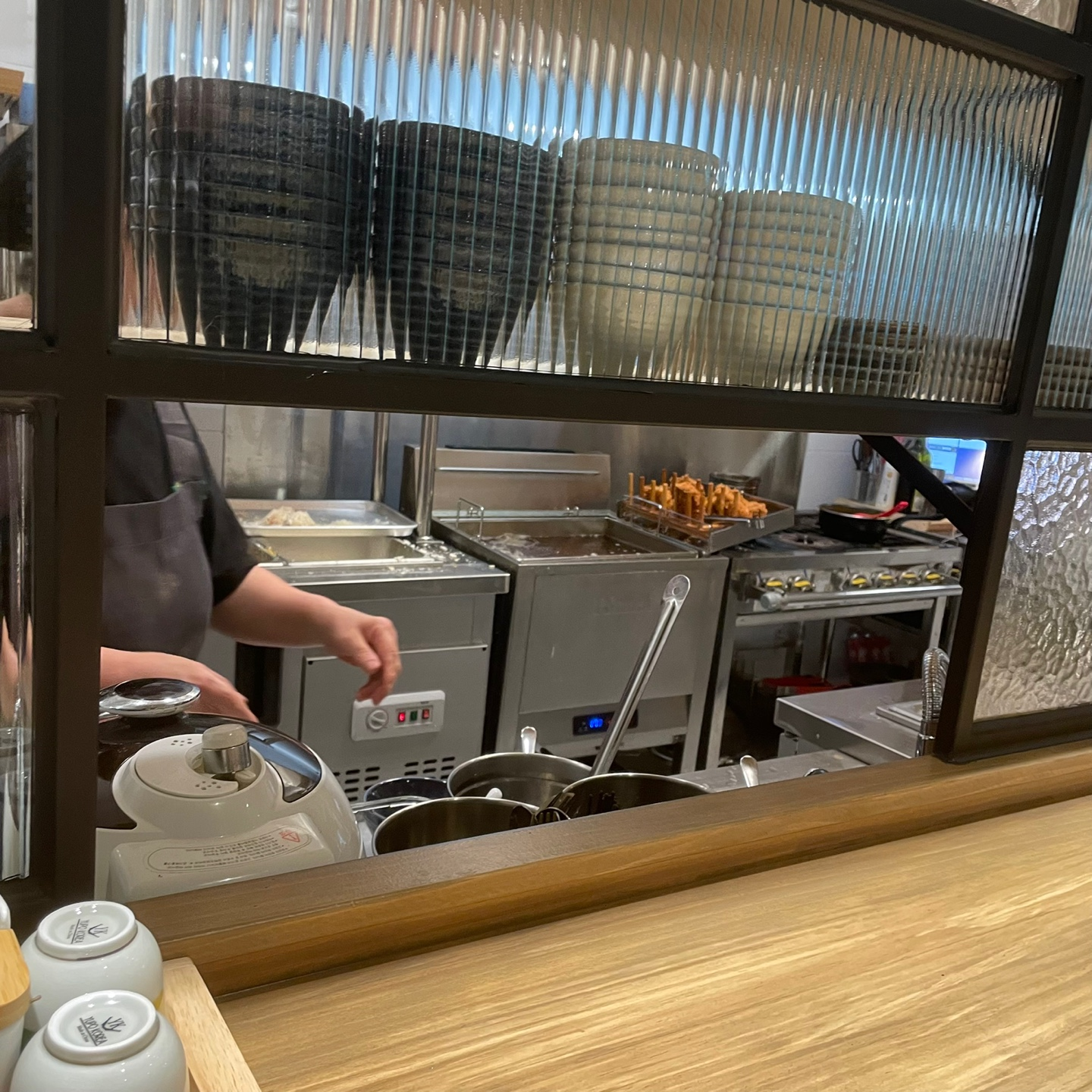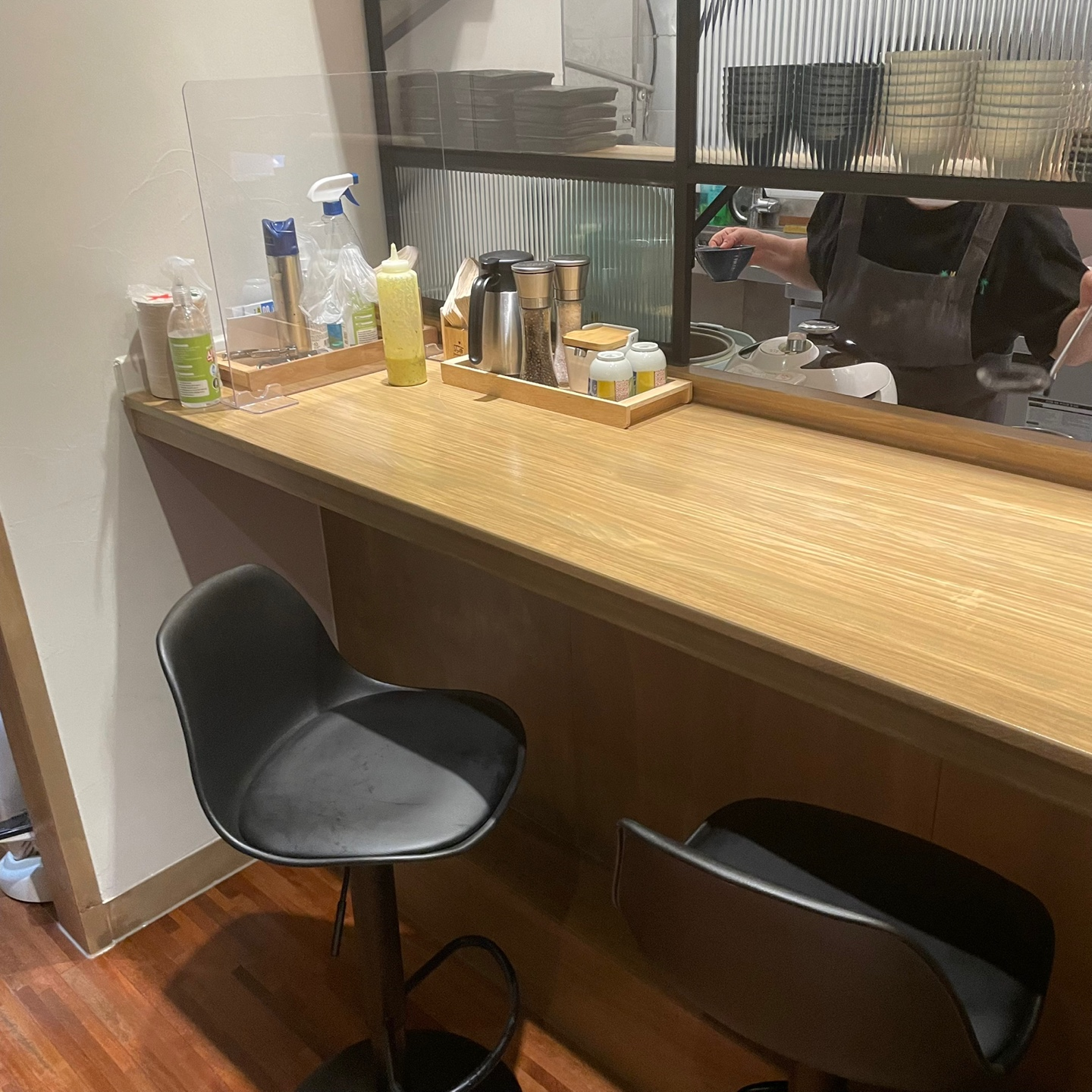 바 테이블에서는 바로 조리하는 곳을 볼 수 있는 반 오픈 키친 형태였어요. 바 테이블과 주방 사이의 공간으로 음식을 주고받고 식기를 더 요청할 수도 있어서 참 편하더라고요!