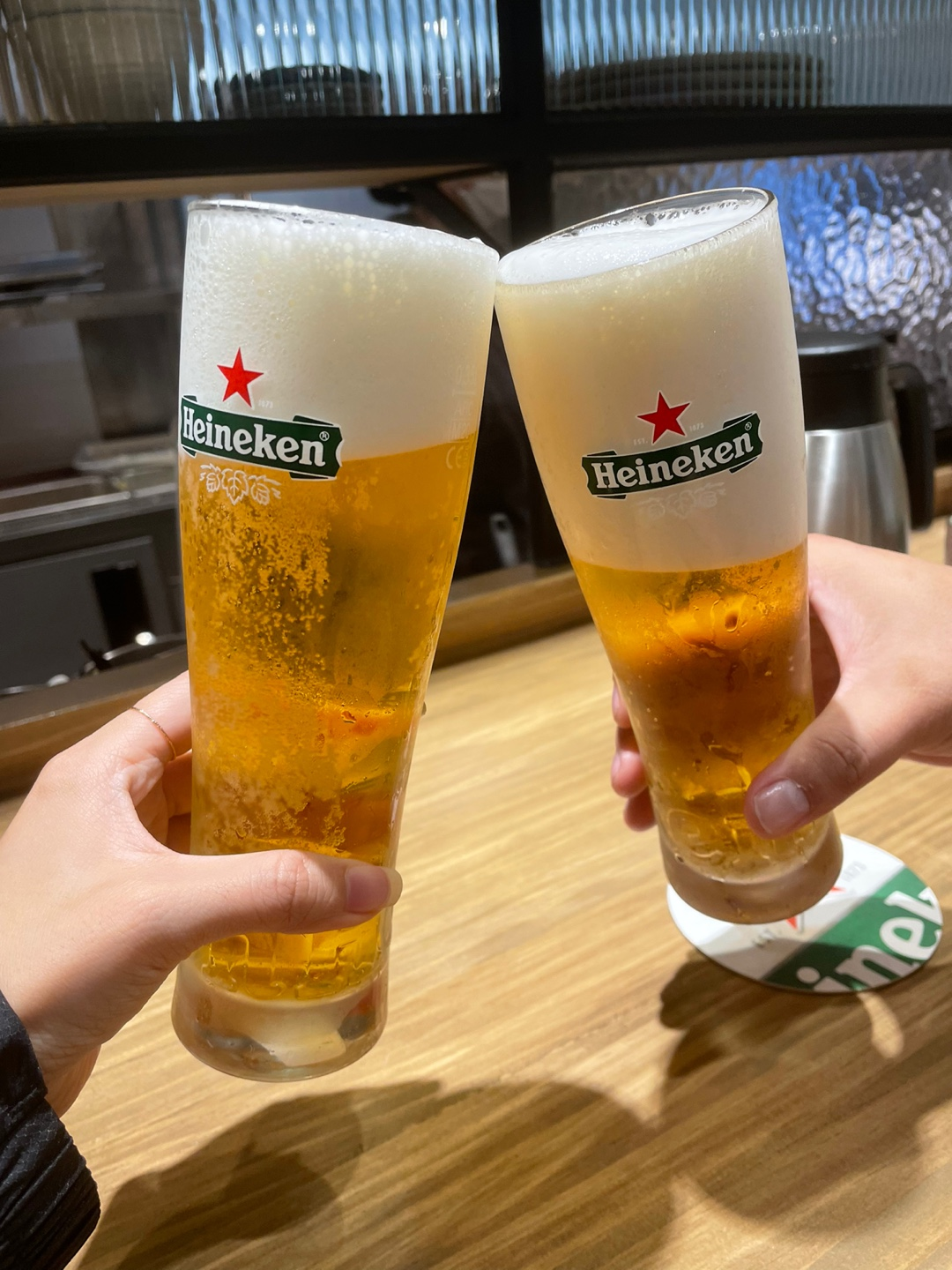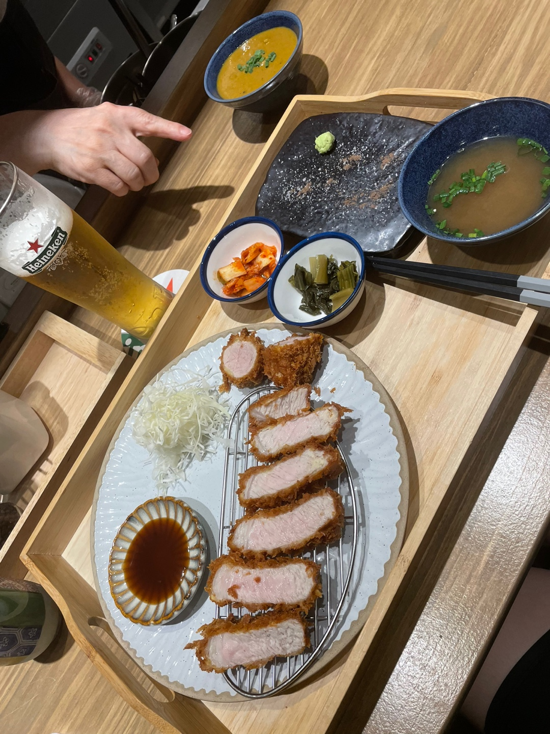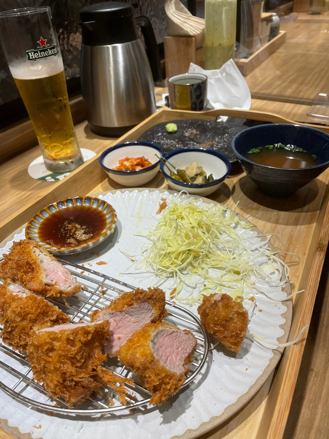 저희는 둘이 가볍게 반반 카츠, 안심 카츠, 카레 추가, 하이네켄 생맥주 2잔을 주문하고! 4인 / 2인 테이블을 지나 바 테이블에 안착했습니다.