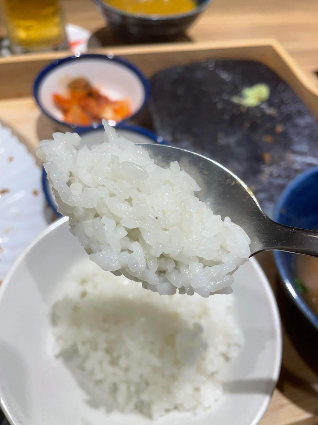 손님들이 많아서 저희 밥은 조금 늦게 나왔는데, 아니 이 쌀밥이 왜 이렇게 맛있는 거죠? 하다 하다 밥도 맛있으면 어떻게 해! 윤기가 좌르르 흐르는 수분 가득한 쌀맛! 카레랑 찰떡이에요.