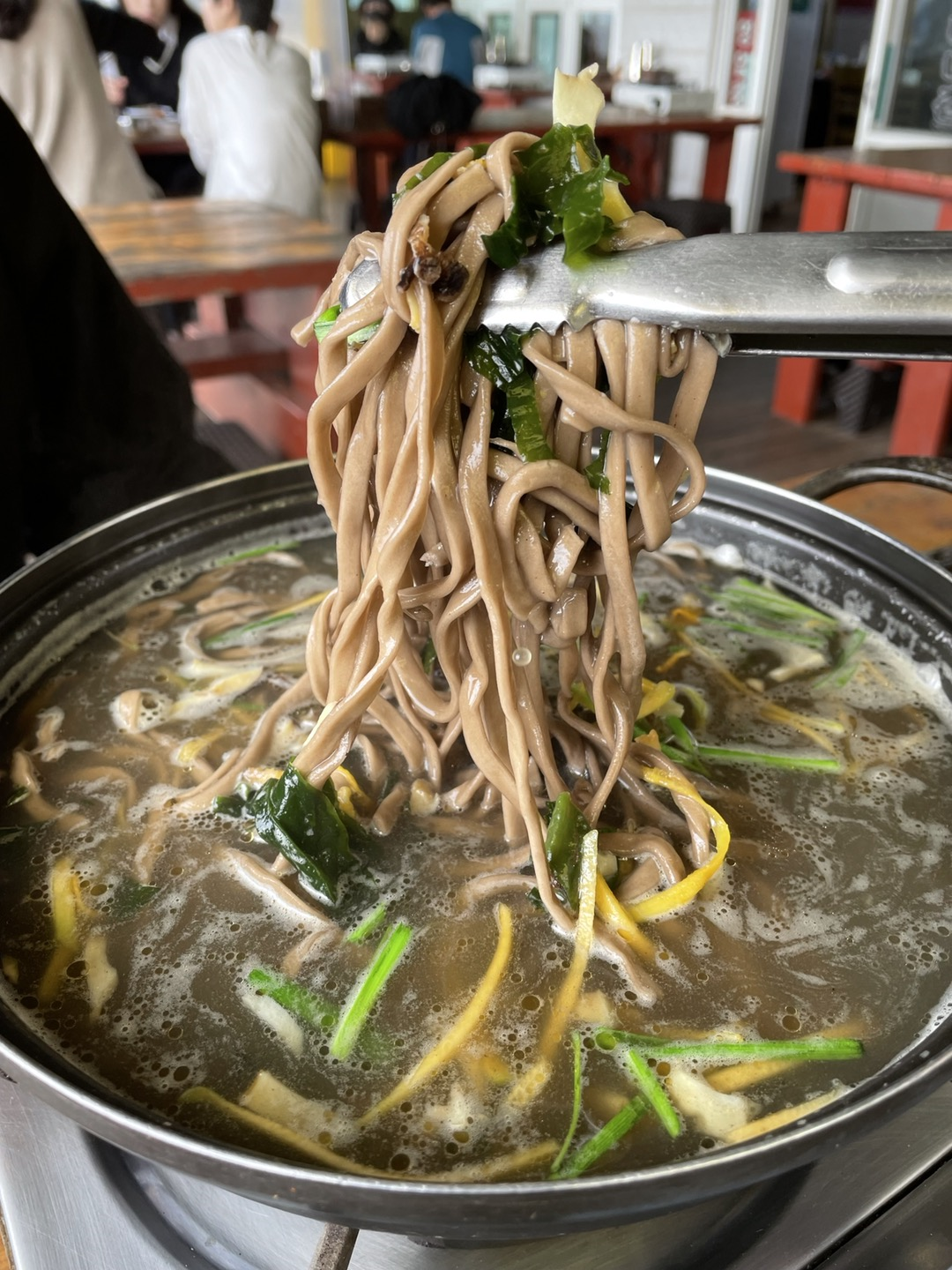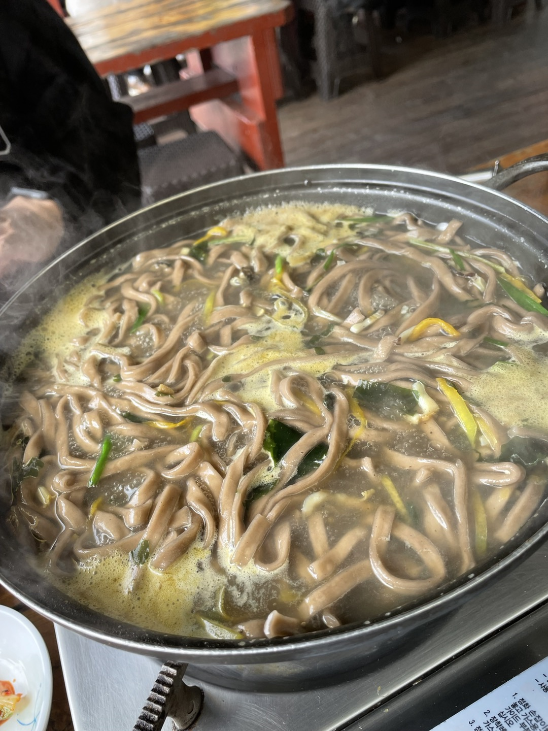 대기한 지 얼마 지나지 않아 바로 칼국수가 세팅되었어요. 미리 한 번 끓여 나온 칼국수였기에 한소끔 끓으면 바로 먹을 수 있었죠. 처음 보는 비주얼에 한 번 놀람, 그리고 이후 엄마가 합류한 후 제주시에서 또 도전하였으나 이곳이 제일 맛있었다는 것을 알고 또 놀람!(우도 맛집이 아니라, 제주 보말칼국수 맛집입니다!)
