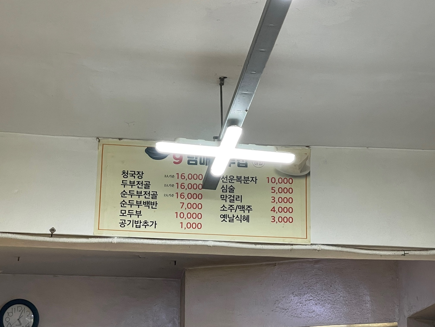 그리고 바로 깨달은 건 이곳이 현지인 맛집이란 것! 누가 봐도 관광객은 저희뿐이었답니다. 착한 가격을 확인 후 마음먹고 온대로 순두부전골 2인을 바로 주문했어요.