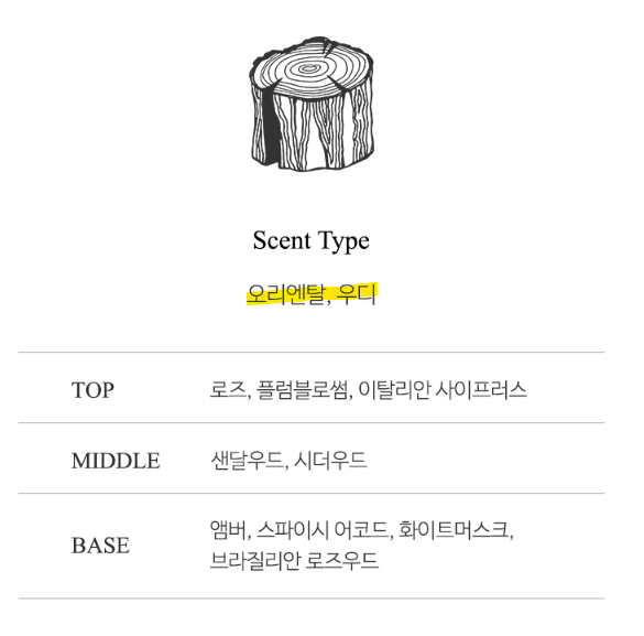 묘하게 신성하고 동양적이고 우디 한 향이 특징이라고 하네요. 끝 향으로는 머스크 향이 감돌아요! 훅 들어오는 센 향보다는, 신비로우면서 편안한 우디향을 원하신다면 딥디크 탐다오 오뜨 뚜왈렛 추천해요.
