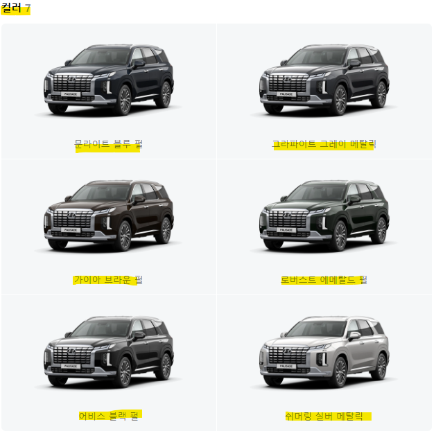 컬러는 아래 사진을 참고해주세요. 쨍한 색보단 메탈에 어울리는 잔잔한 컬러를 추구하는 것 같아요. 현대 펠리세이드가 추구하는 '고급스러움'을 확인할 수 있는 컬러네요!