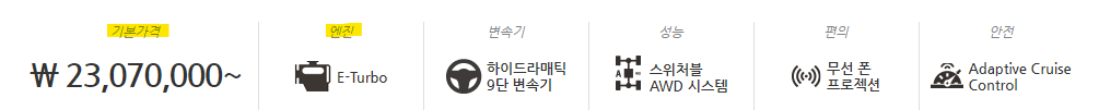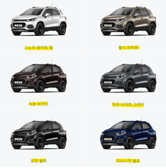 - 추천 이유: 컴팩트한 소형 SUV라 젊은 층에 인기가 많음. 타 모델에 비해 조금 더 힙하고 잘빠진 디자인. 특히, 소형 SUV라 하더라도 쉐보레가 주는 저렴하지 않은 이미지가 30대 첫차로서 합격점(경비와 핸들링 GOOD)
