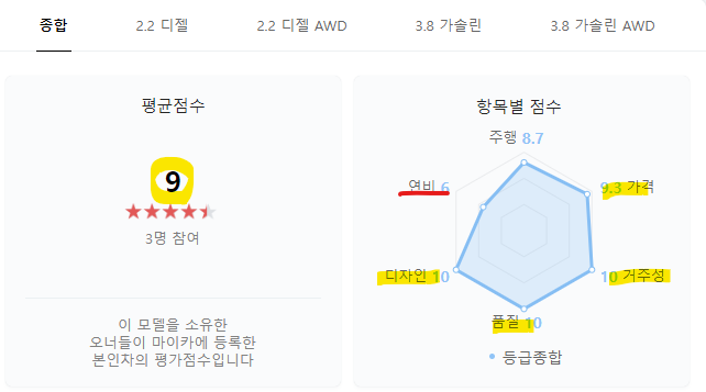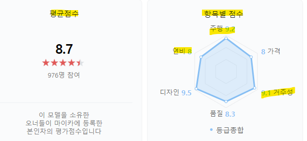 - 오너 평가(주행, 디자인, 연비, 거주성 GOOD)
