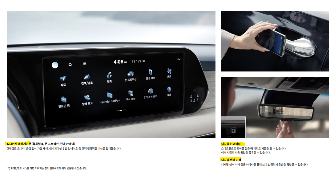 크고 우수한 내비게이션 디스플레이부터 디지털 미러나 스마트폰을 활용한 디지털키 방식은 타의 추종을 불허하네요! (🙏이런 면에선 정말 현대 GOOD)