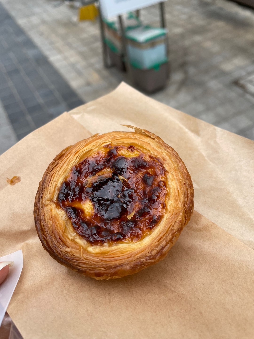구매하고 나니 서비스로 한 조각 주셨어요. 굽자마자 먹어보는 에그타르트. 이 한 입이 제일 맛있어요!
