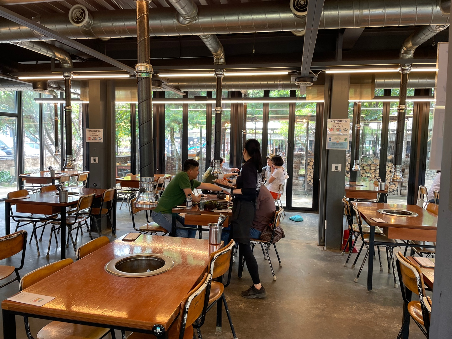 실내 역시 쾌적하네요! 연기도 많지 않고 괜찮았어요. (그러나 굽기 시작하면 직화 숯불이다 보니 가끔 습격이 있다는 점!)