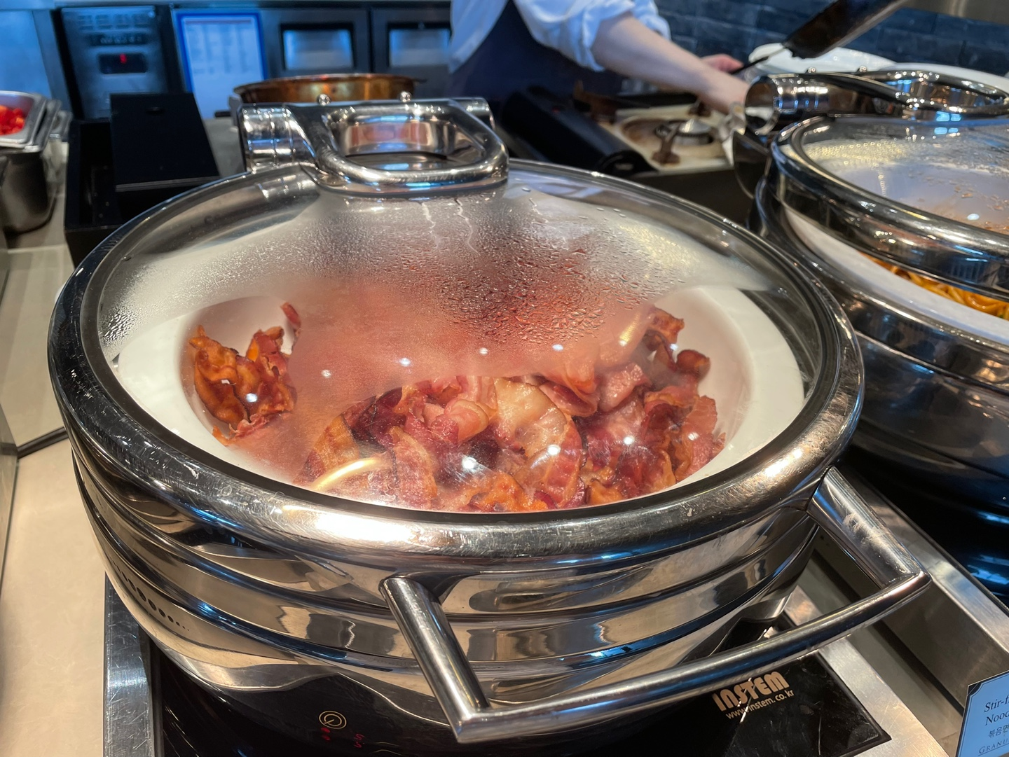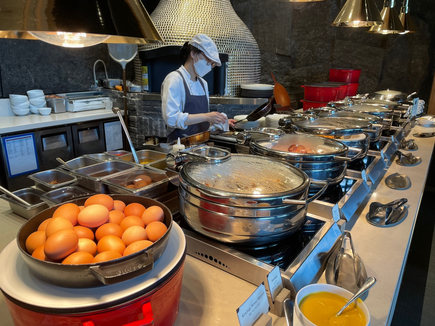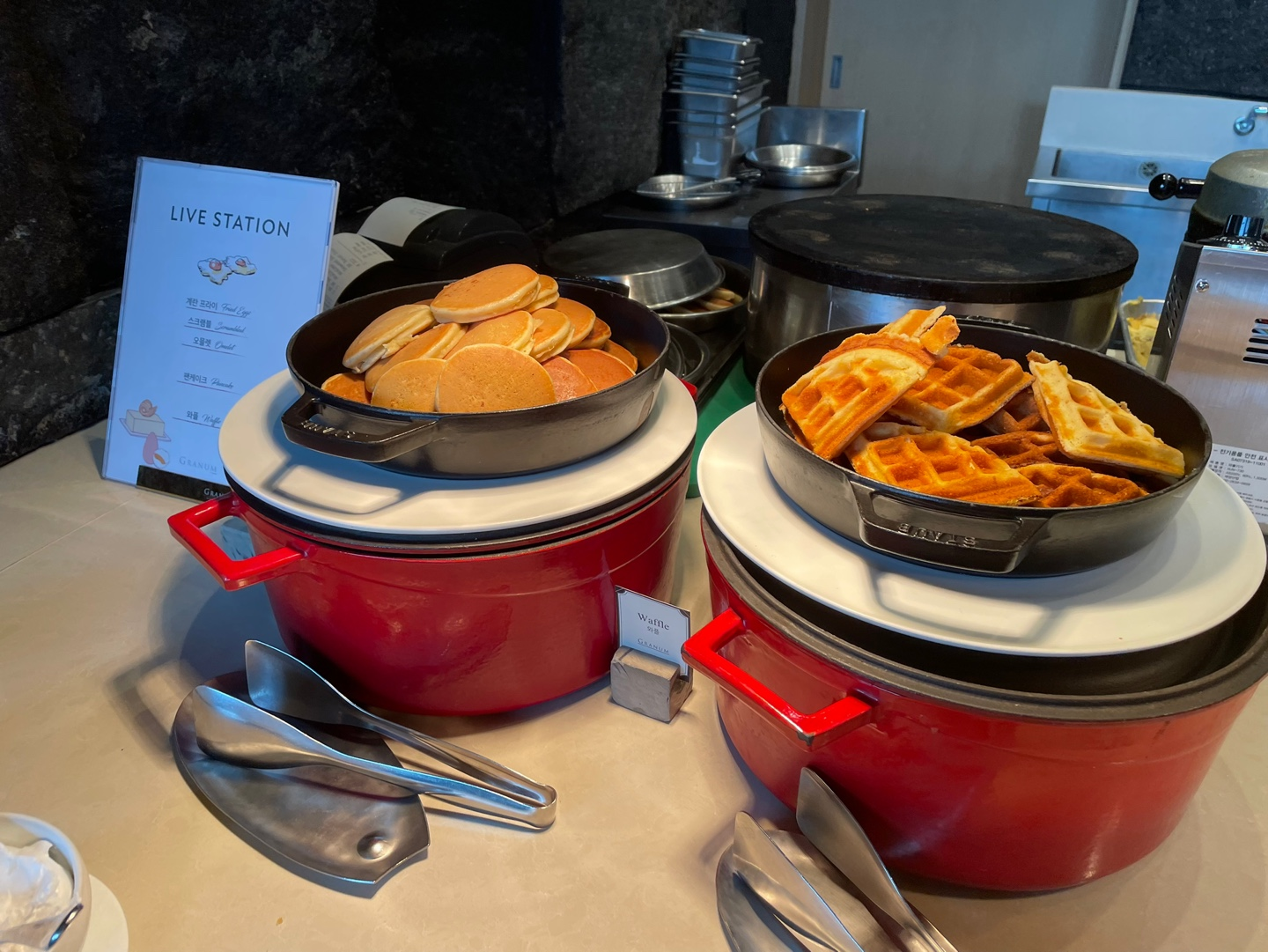 요 라이브 스테이션에서는 직원분께 요청해서 즉석요리된 오믈렛이나 스크램블 혹은 일반적인 계란 프라이를 받을 수 있고요! 그 옆에는 와플이나 미니 팬케익도 있답니다. (미니 팬케익 진짜 맛있어요!)
