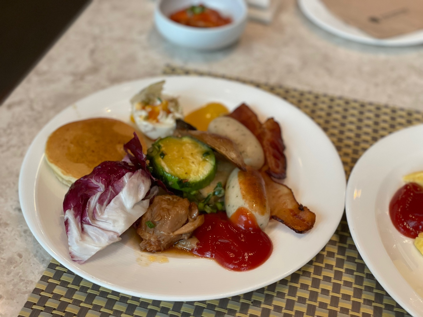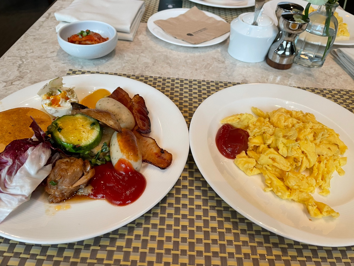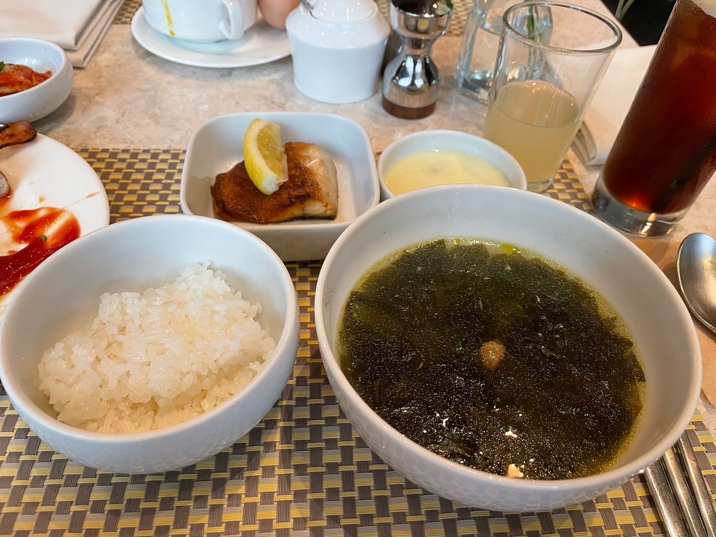 반상이 나오기까지는 한 20분정도 걸린 것 같아요. 미역국 맛보기 전에 벌써 2판 클리어! 우선 조식의 상징인 소시지나 샐러드 그리고 계란 요리류를 픽업하러 가봅니다!