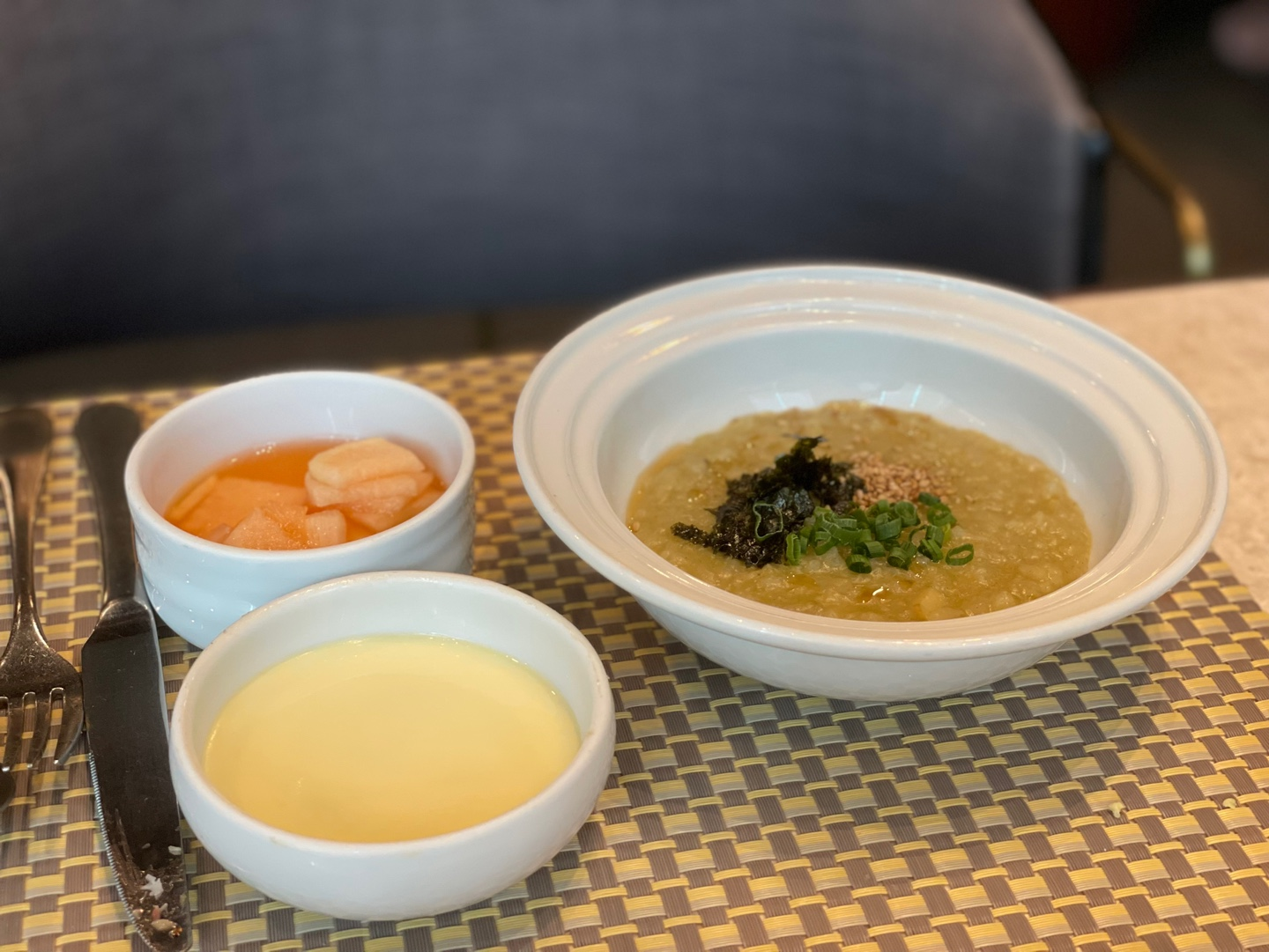 착석하고 나면 '반상'을 선택할 수 있어요. 뷔페식과 함께 제공되는 반상에는 미역국, 전복죽, 북엇국 정도가 있었어요. 저는 당일이 생일이라 운 좋게 미역국을, 남편을 전복죽을 선택했답니다!