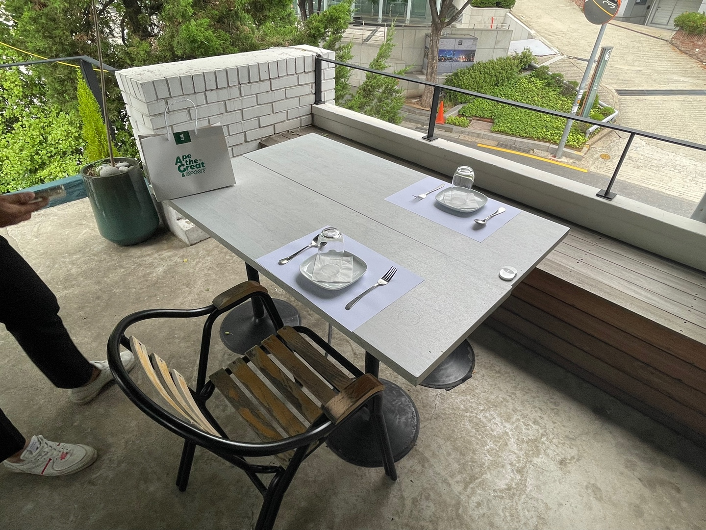 저희는 한산한 일요일 오후 1시에 예약 방문했고 테라스석으로 했어요. 요즘처럼 비가 올 경우에는 사전에 자리를 옮겨달라고 하시면 좋을 것 같아요.