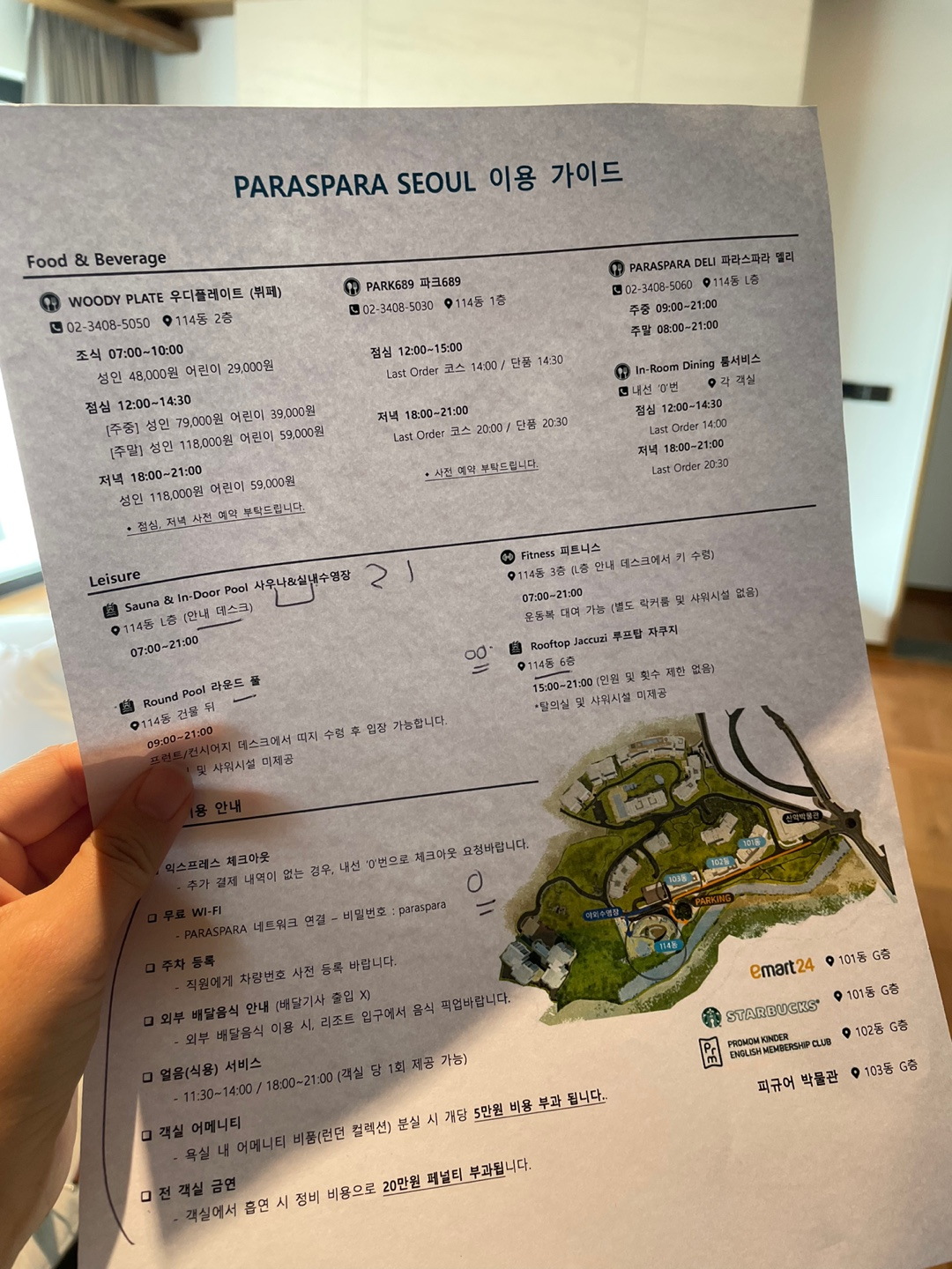 뷔페인 우디 플레이트나 옥상 자쿠지 그리고 사우나까지 모두 114동에 있었어요. 저희 103동 바로 앞이어서 편리하게 다녔습니다! (체크인 시 카페에서 사용 가능한 아메리카노 쿠폰 2장도 있으니 잊지 마세요!)