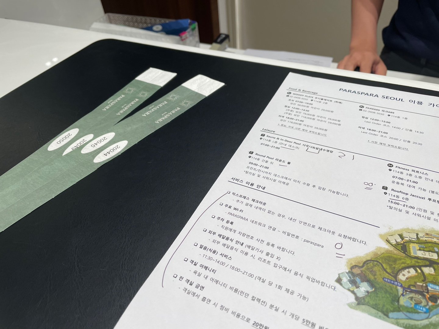 체크인 시 이것저것 설명을 듣고 수영장을 사용할 수 있는 종이 팔찌를 받아 올라갑니다! 수영장은 투숙하는 동안 무제한으로 사용 가능하고, 팔찌는 프런트에서 매번 받을 수 있어요! 주 이용 가이드는 아래와 같아요.