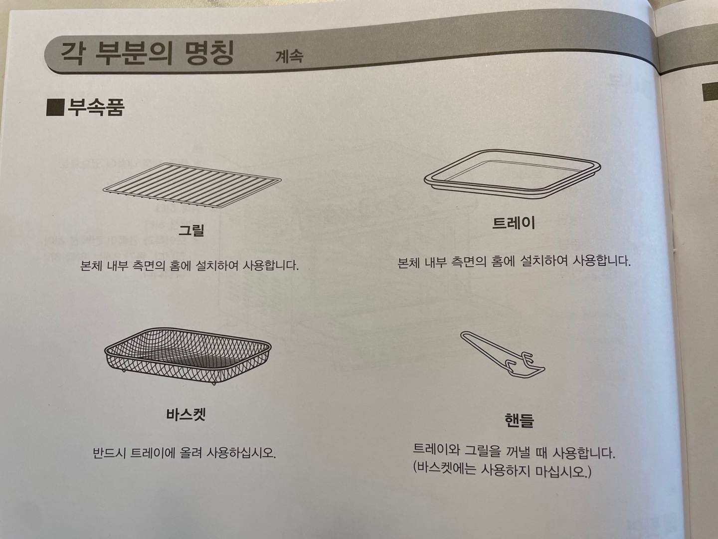 부속품으로는 그릴 / 트레이 / 바스켓 / 핸들이 포함되어있어요.