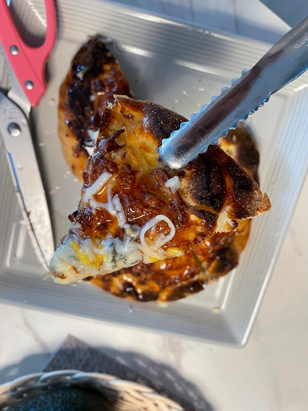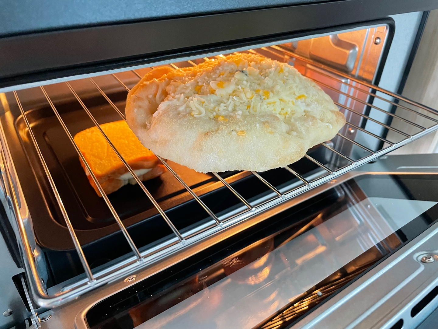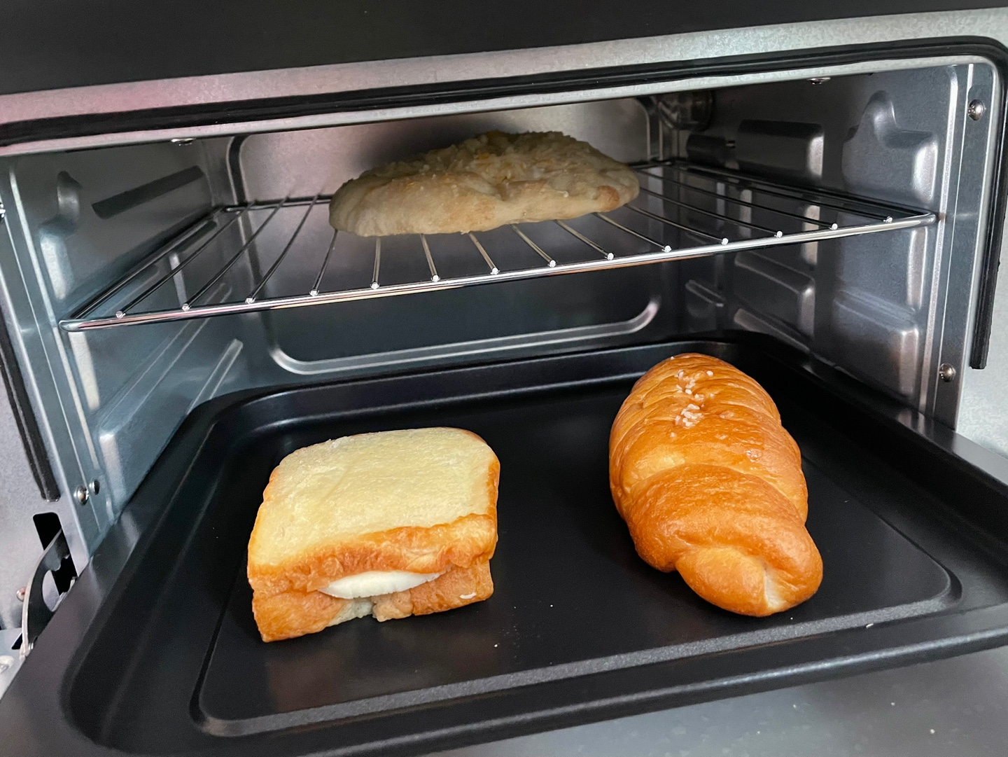 저는 위층 그릴에는 냉동 피자를, 아래층에는 트레이를 두어 딱딱한 소금 빵과 부드러운 토스트도 동시에 조리해봤어요.