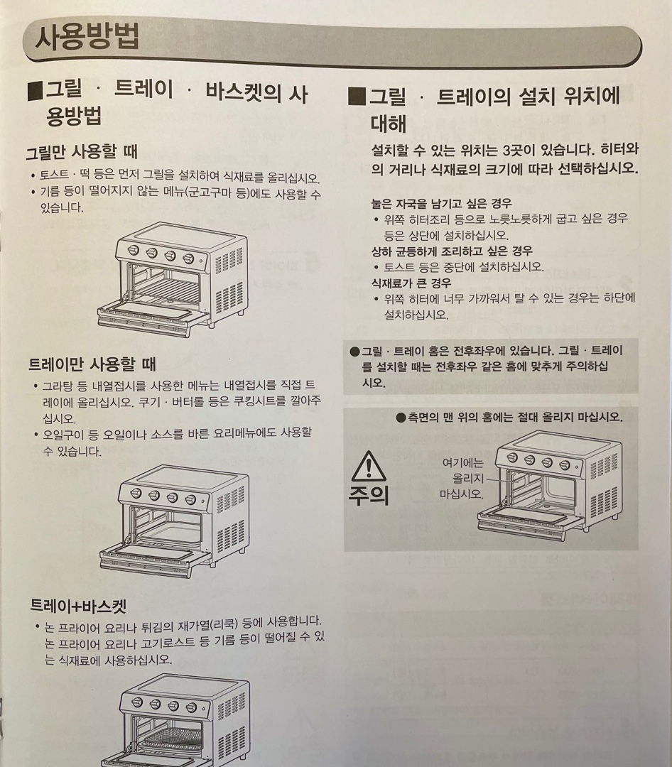 그릴의 경우 고기나 생선 등 그릴링을 하며 구워줄 재료들을 놓으면 되고, 트레이의 경우 기름 받이용으로 그릴과 동시에 넣어 쓰거나, 트레이 자체에 음식을 넣어 데우거나 조리할 수 있어요. (사실 사용법은 저도 아직 잘 모르겠어요...)