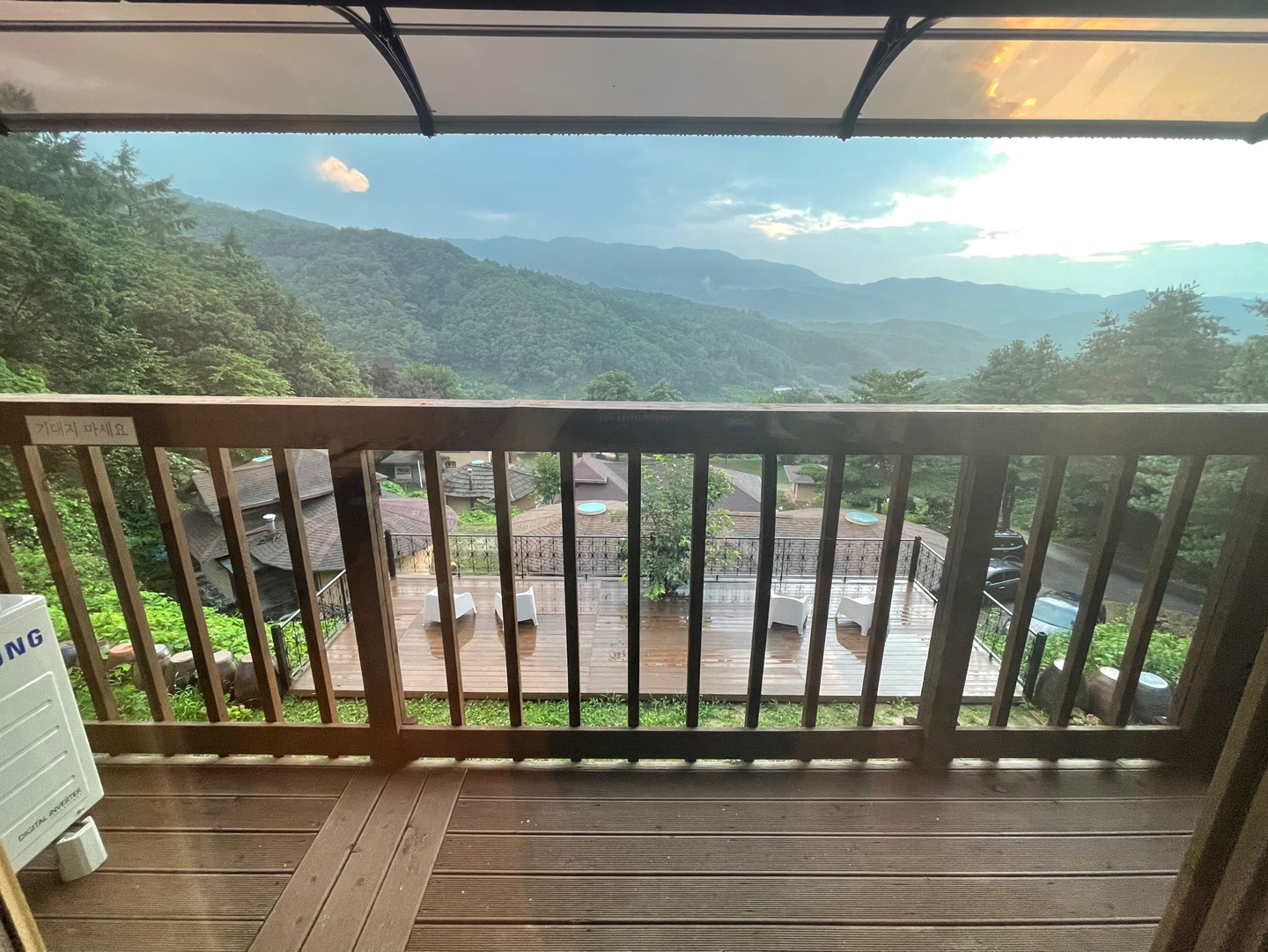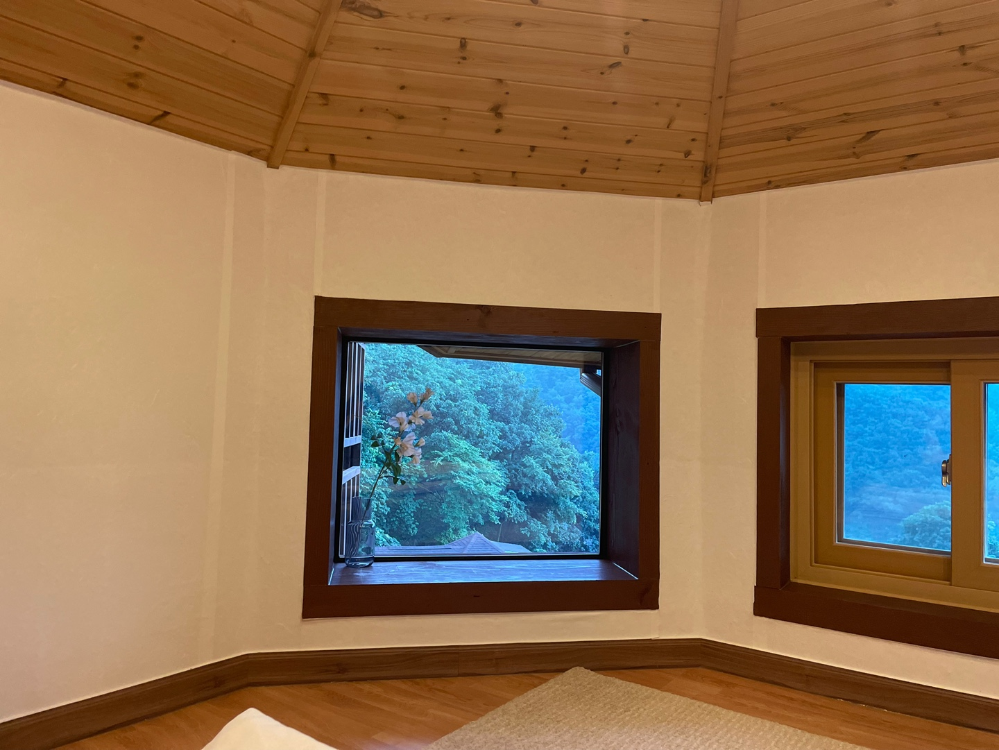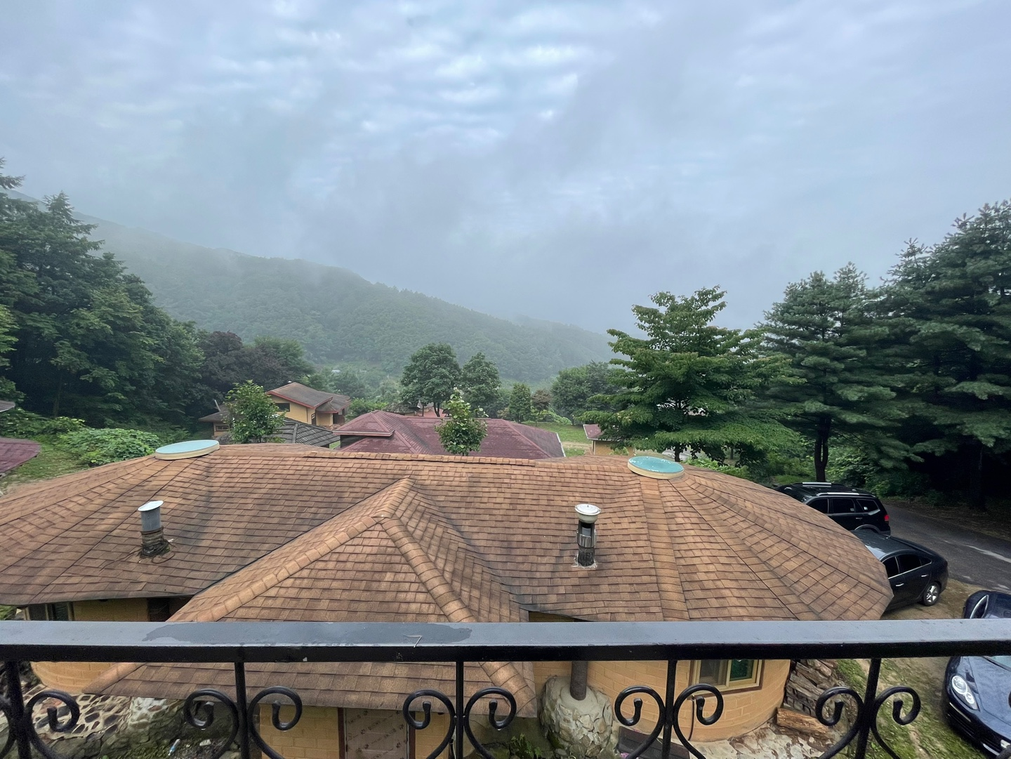 저희는 가장 위에 있는 집에서도 2층인 '조화'룸에 묵었습니다! 아쉽게도 흐리긴 했지만, 마치 숙소 창문을 통해 바라보는 산 뷰가 너무 멋졌어요. 마치 수묵화처럼 그려진 산 능선이 쭉!