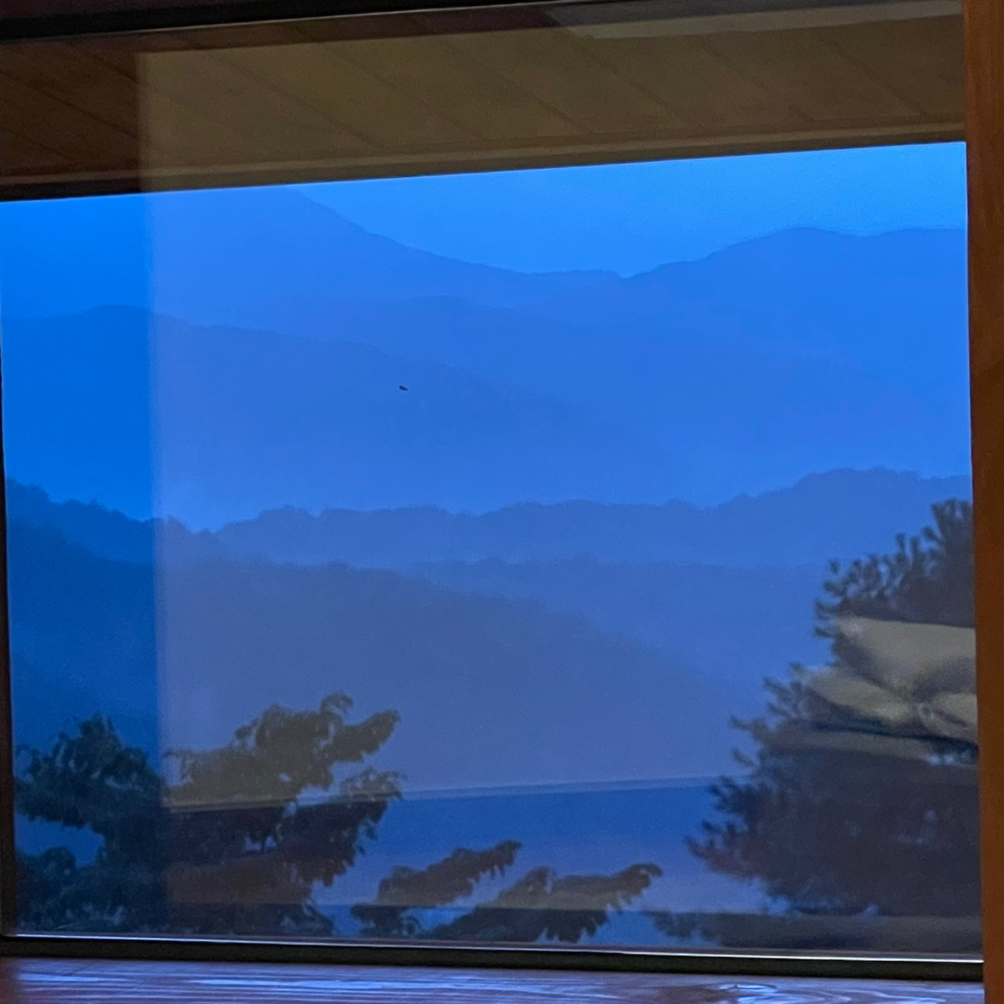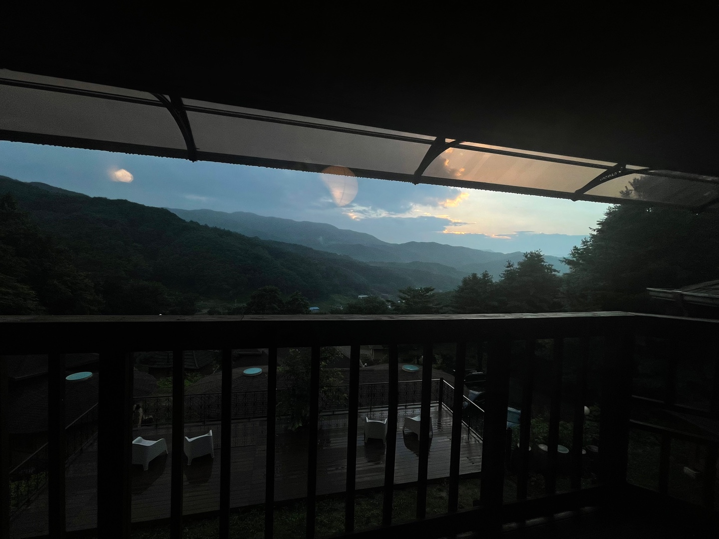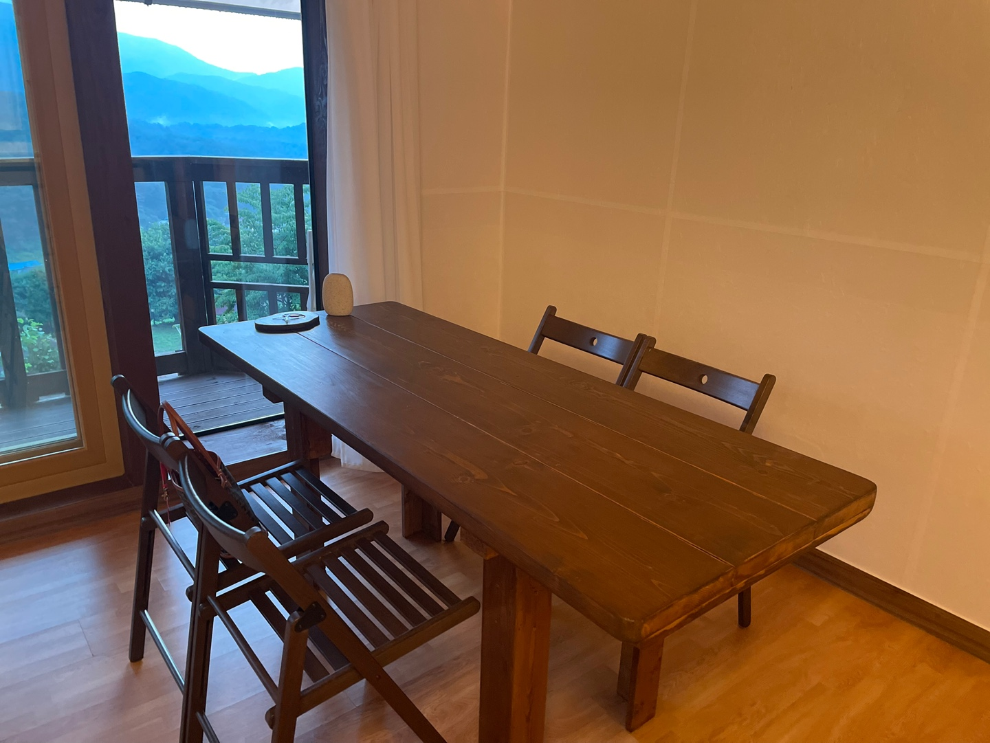 저희는 가장 위에 있는 집에서도 2층인 '조화'룸에 묵었습니다! 아쉽게도 흐리긴 했지만, 마치 숙소 창문을 통해 바라보는 산 뷰가 너무 멋졌어요. 마치 수묵화처럼 그려진 산 능선이 쭉!