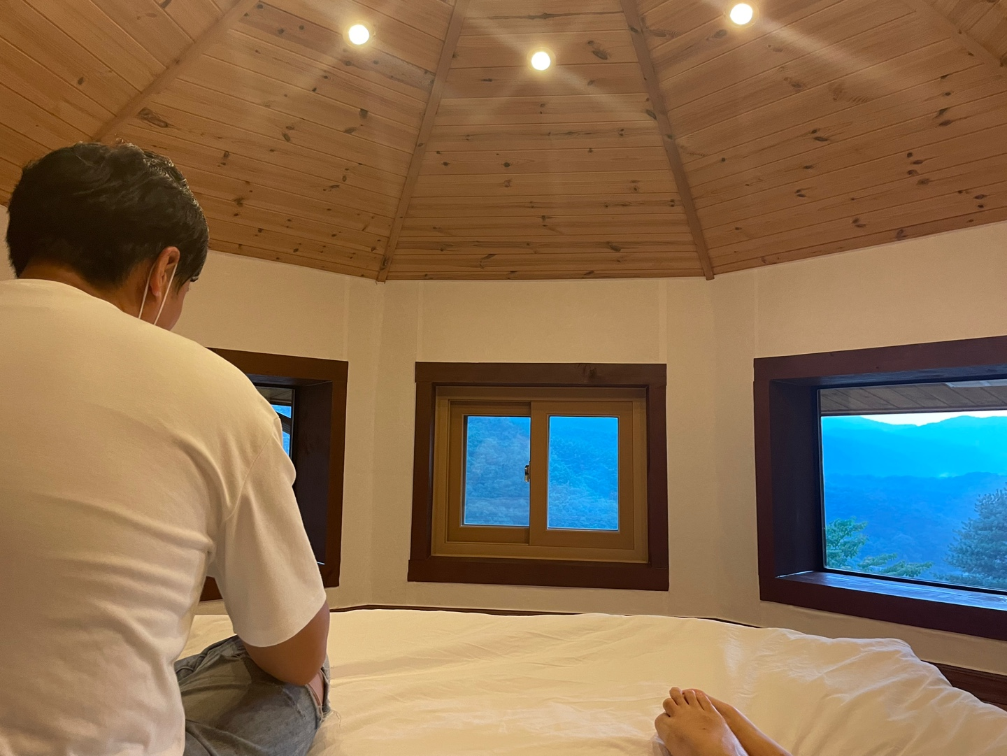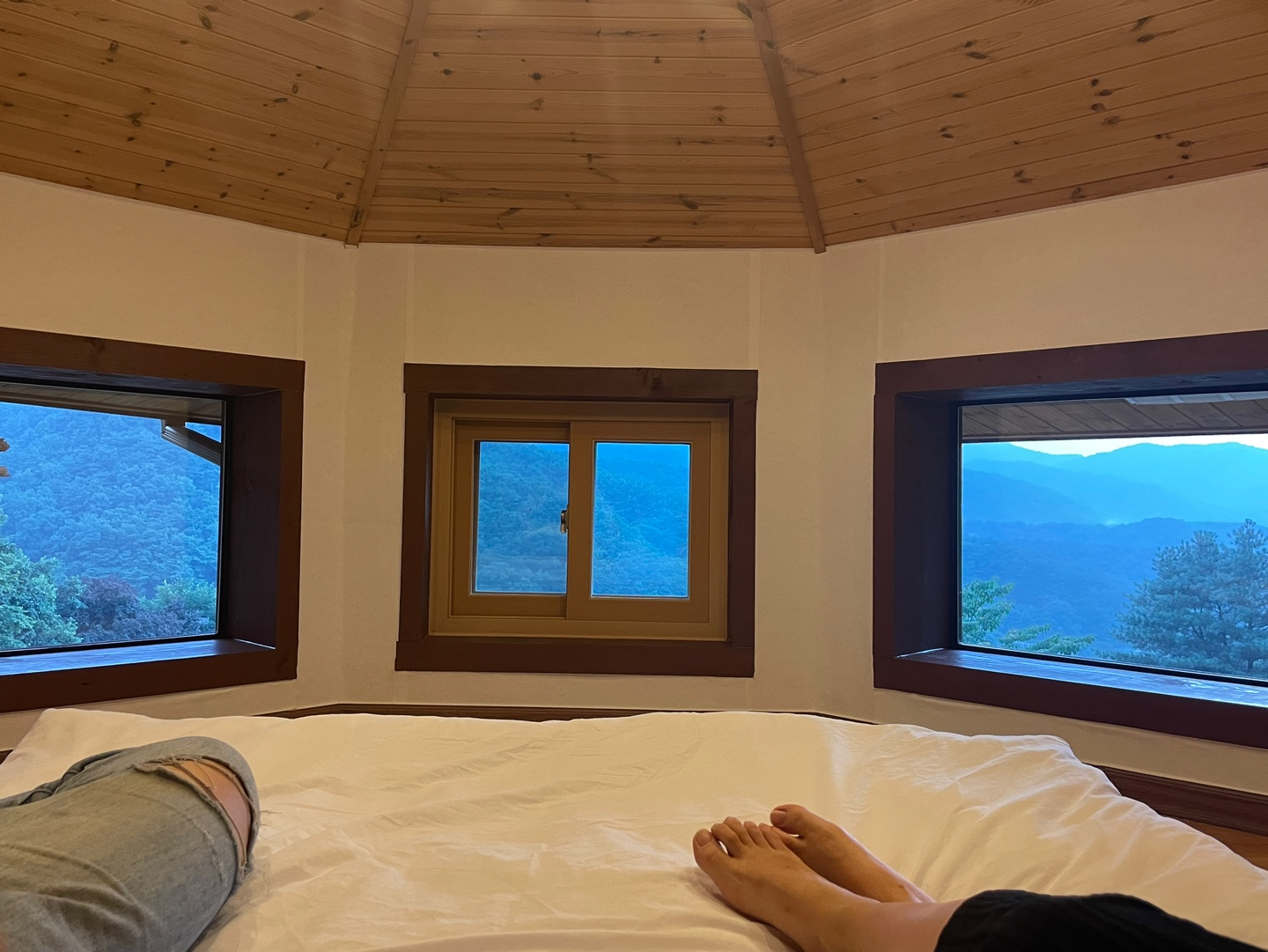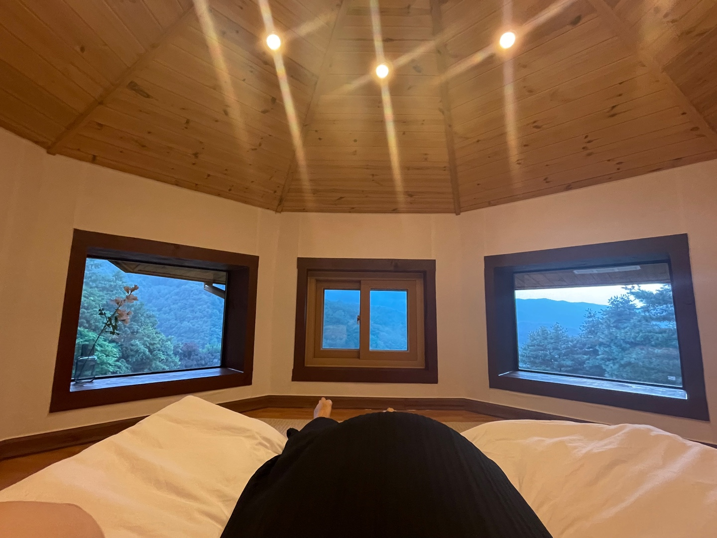 예약할 때 이미 사진으로 봐서 감흥은 덜했지만, 세 개로 된 창문과 이를 바라보게 눕혀진 침대 흑흑. 20시 취침의 비밀이 바로 여기에!