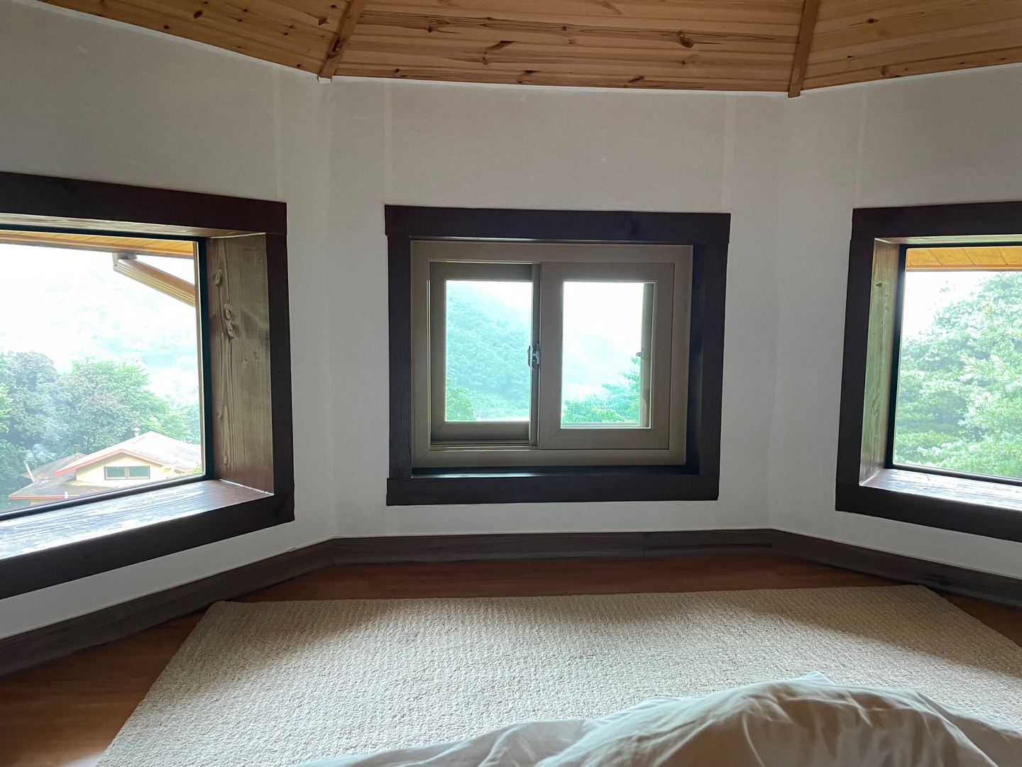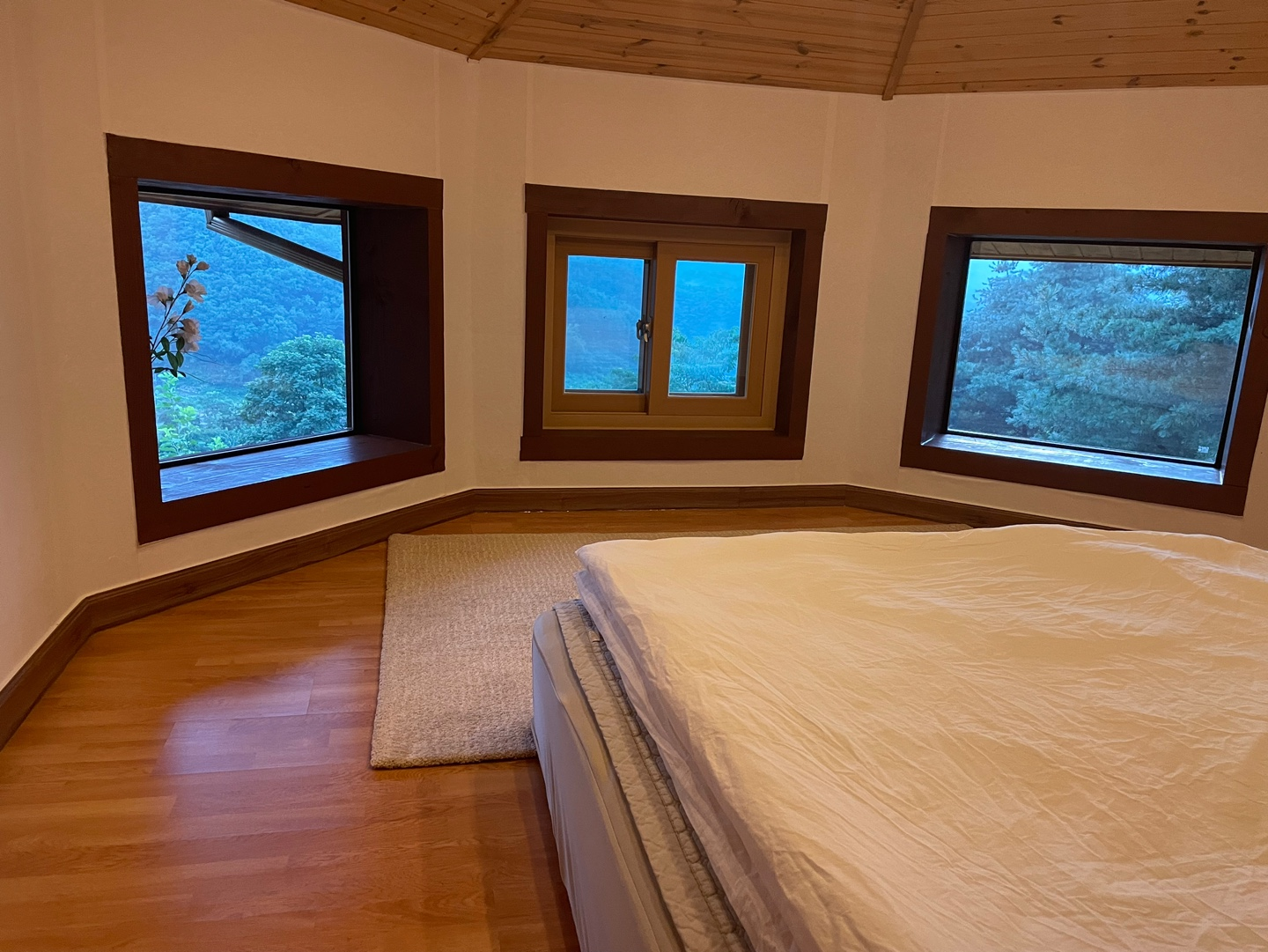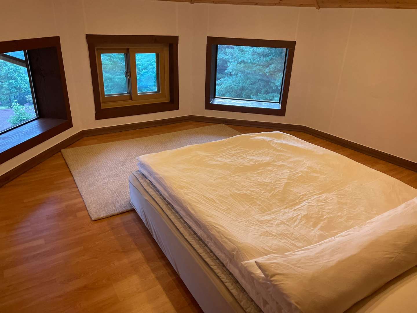 예약할 때 이미 사진으로 봐서 감흥은 덜했지만, 세 개로 된 창문과 이를 바라보게 눕혀진 침대 흑흑. 20시 취침의 비밀이 바로 여기에!