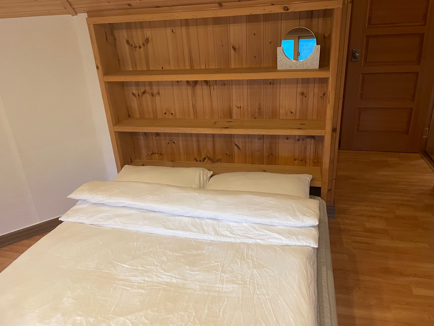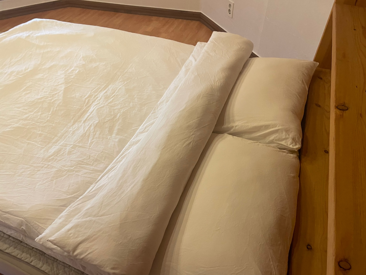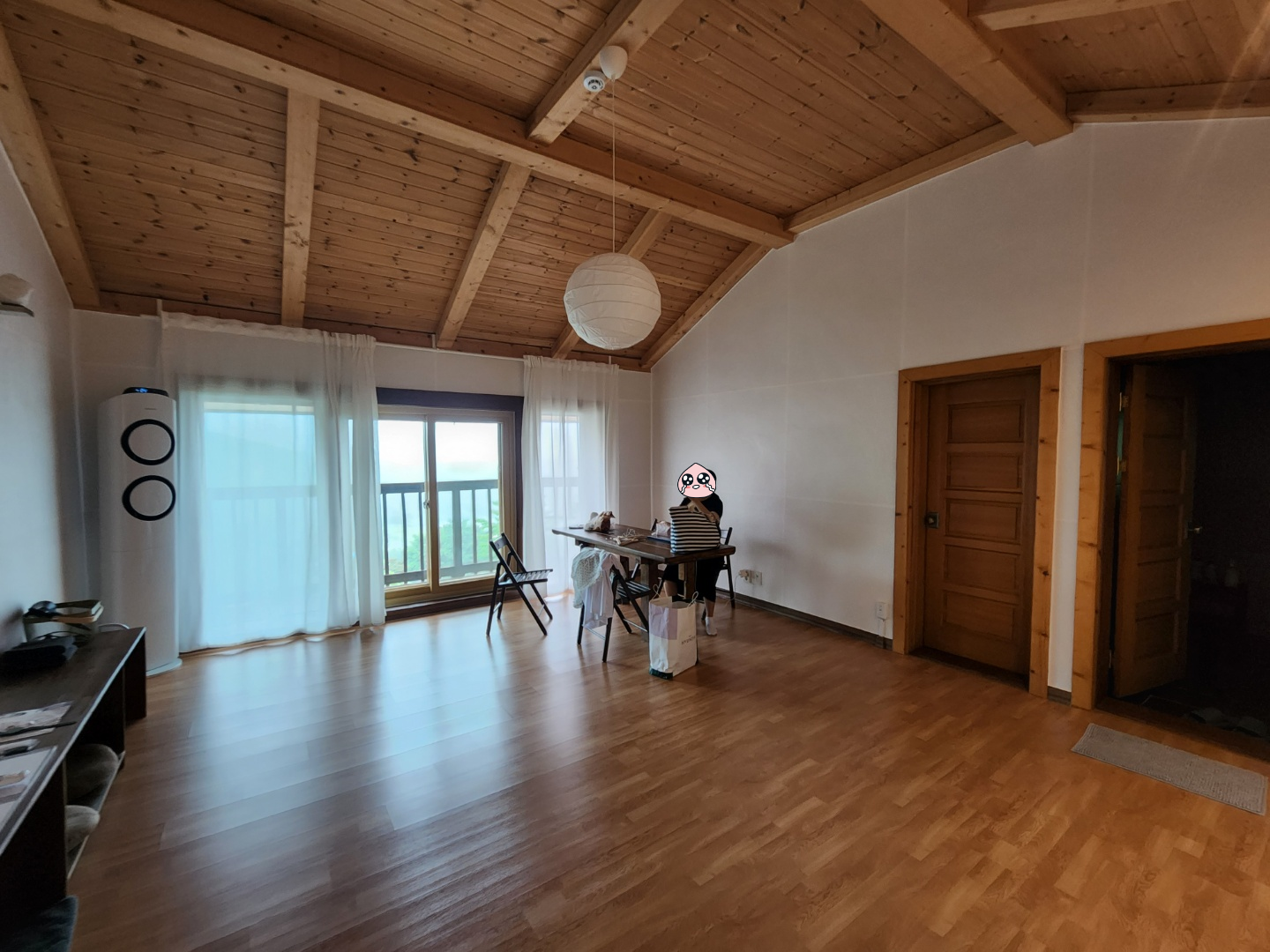 거실로 들어서니 생각보다 넓은 거실에 한 번 놀라고, 방을 보고 두 번 놀랐어요! 흙집에 원목 인테리어라니... 이래서 저녁 8시에 잠들어버린 건 비밀.
