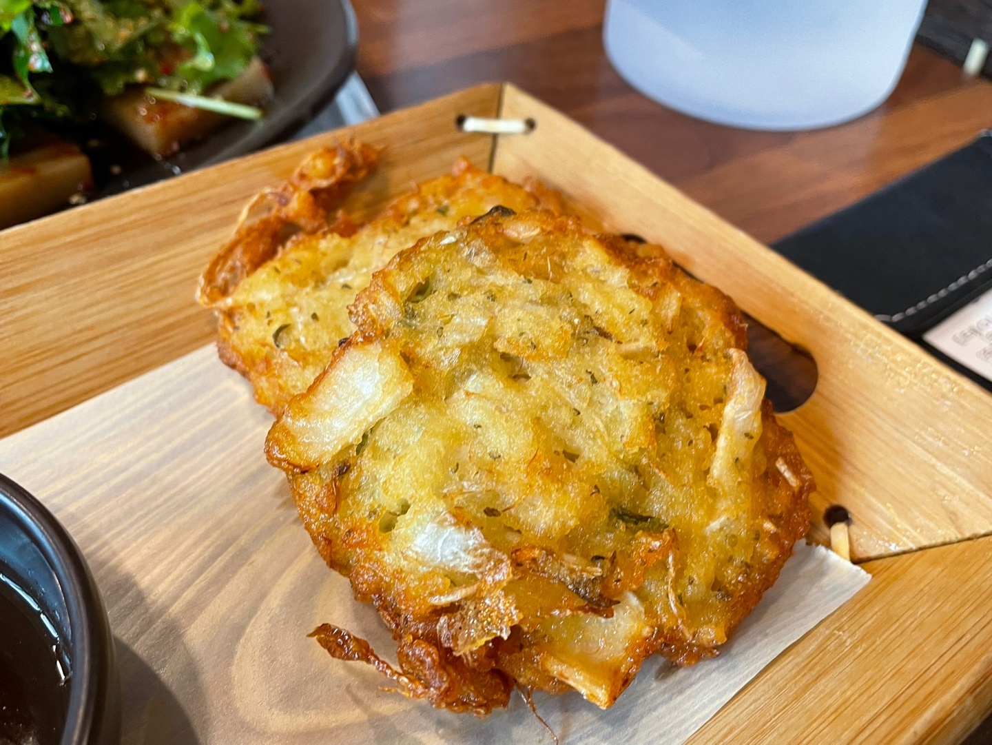 먼저 들깨백숙과 바삭한 빈대떡 그리고 도토리묵무침이 서빙됩니다. (🤝남편은 들깨 백숙을 좋아했고, 저는 요 빈대떡이 의외로 맛있떠라고요!)
