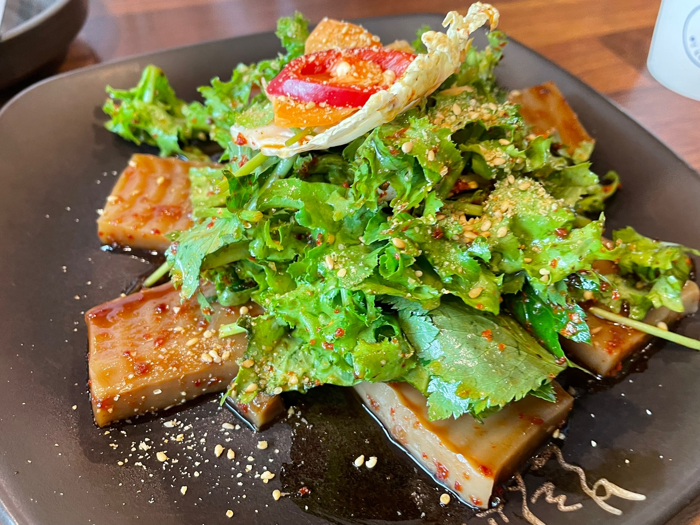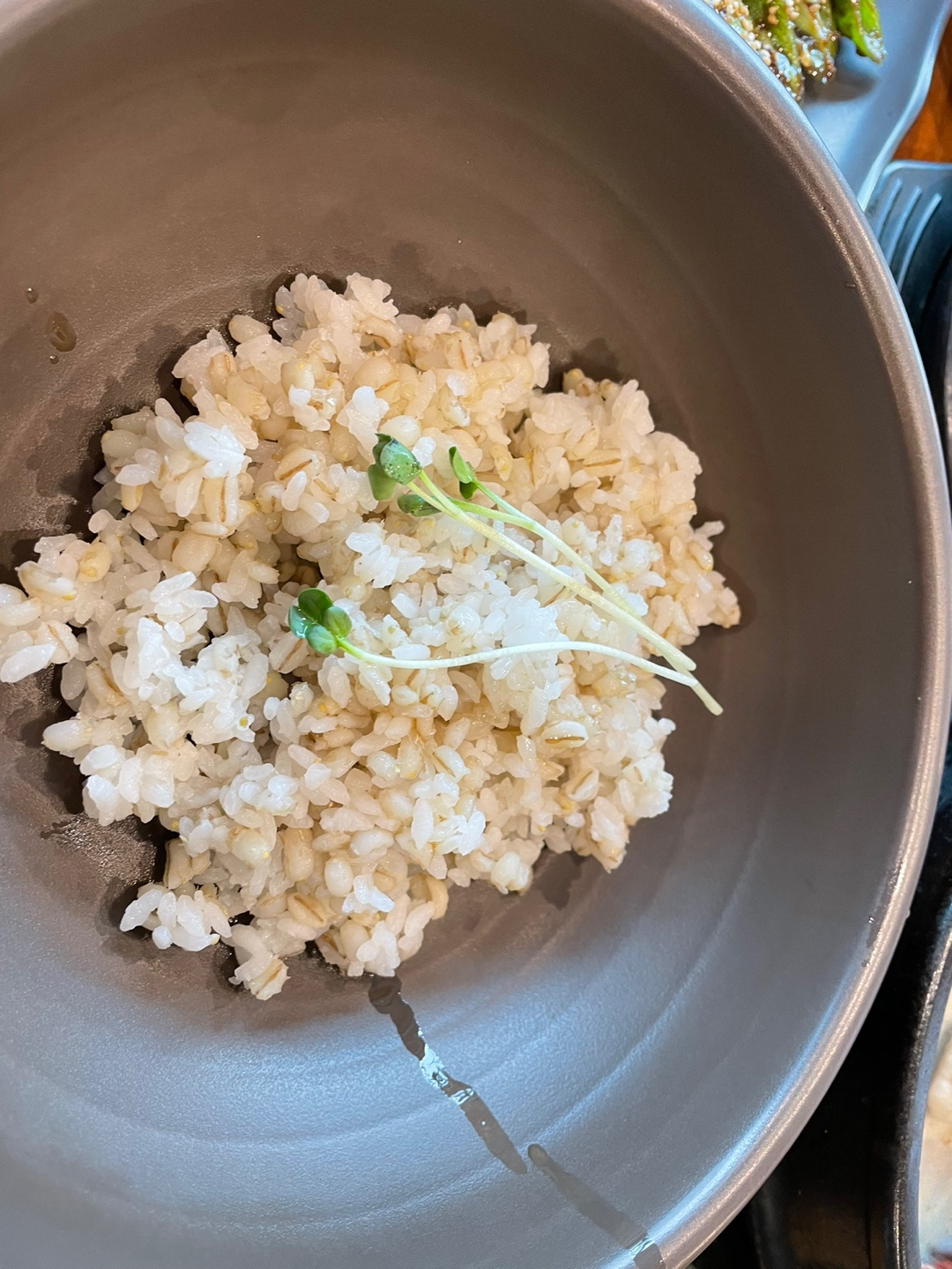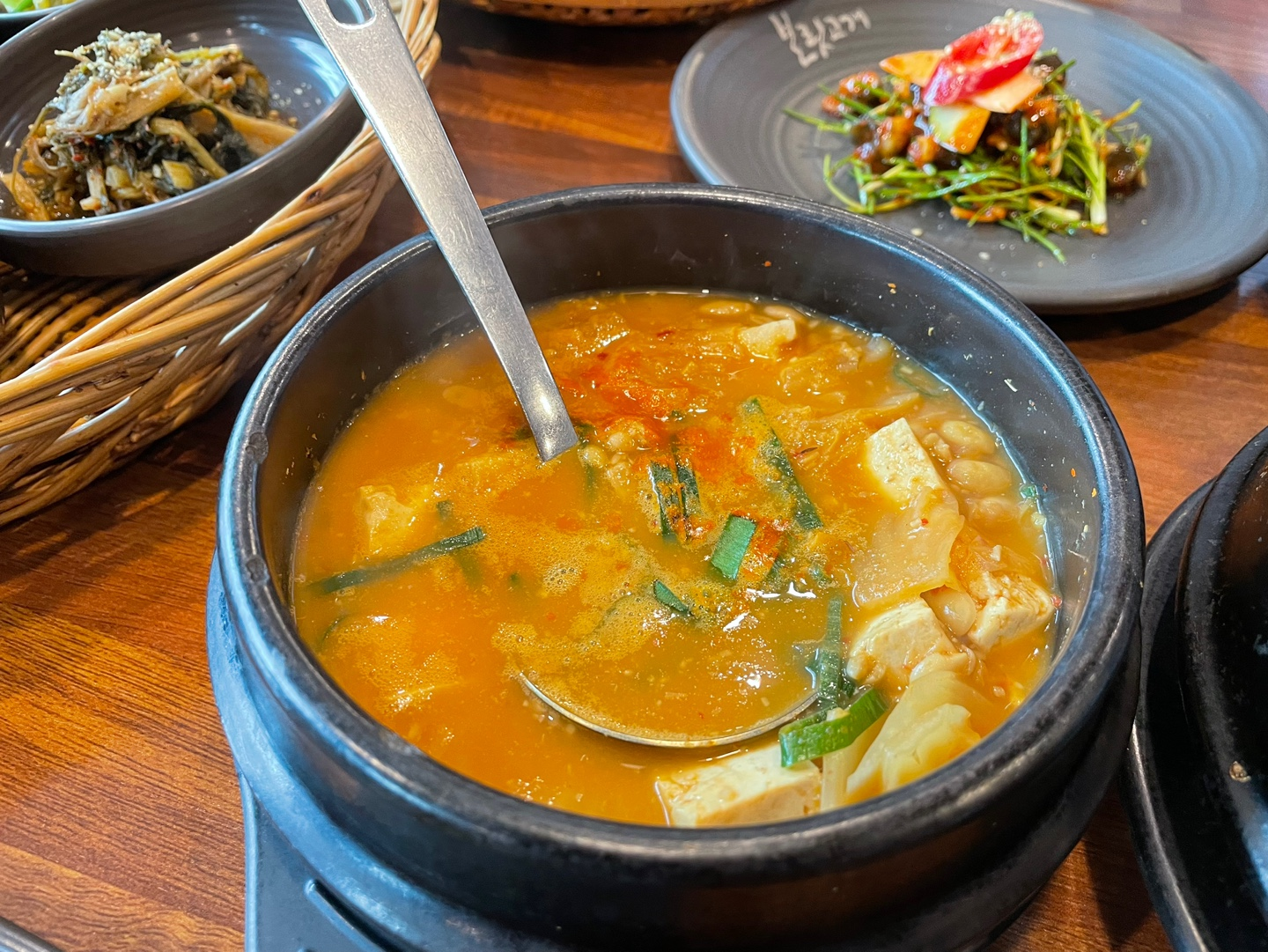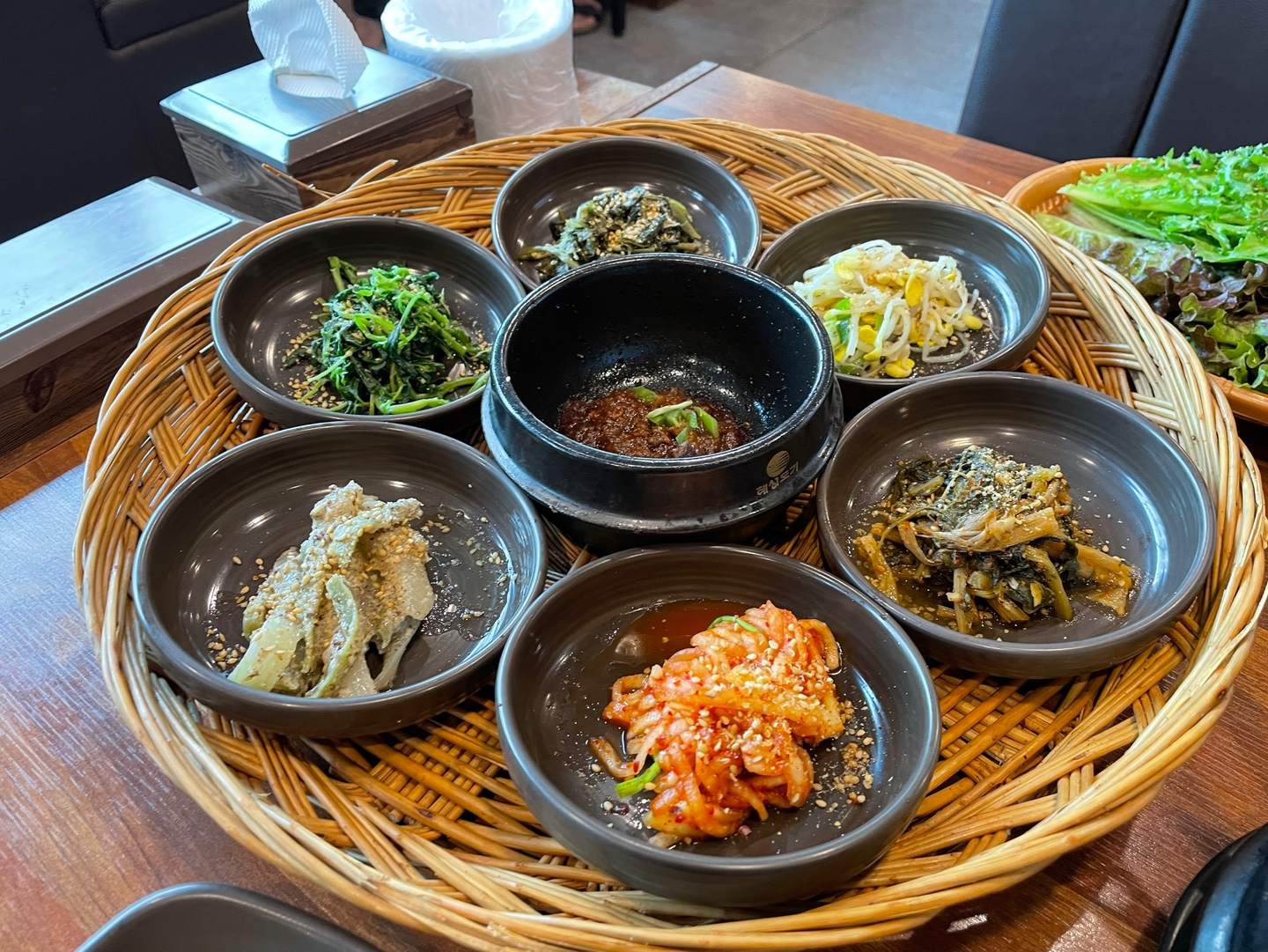 좌측으로 상이 또 차기 시작해요. 약간은 새콤했던 청국장과 보리밥에 함께 비벼먹을 반찬들이 나왔어요. 중간에 있는 강된장이 맛있었고, 청국장은 살짝 심심한 느낌?