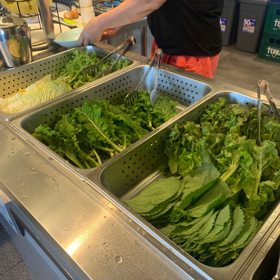 주문하면 원하는 반찬을 담을 수 있는 샐러드바가 있습니다. 샐러드바를 채우는 걸 목격했는데 위로 포장되어 굉장히 위생적이라는 느낌을 받았어요. 역시 기대 이상이에요. 계란프라이도 직접 해 먹을 수 있답니다.