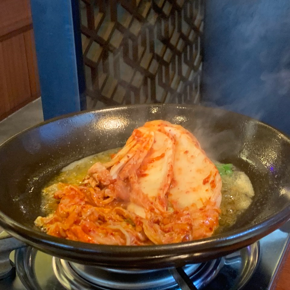 특히, 양념고기가 아닌 생고기를 시키면 제공되는 김치 볶음! 버터와 함께 볶아주시는 이 김치볶음도 예술이었어요. 결국 저희는 셋이가서 이베리코 흑돼지 세트(45,000)에 천겹살을 추가해서 먹었어요. 그리고 대망의 할인 프로모션 중인 냉면이 나왔습니다!
