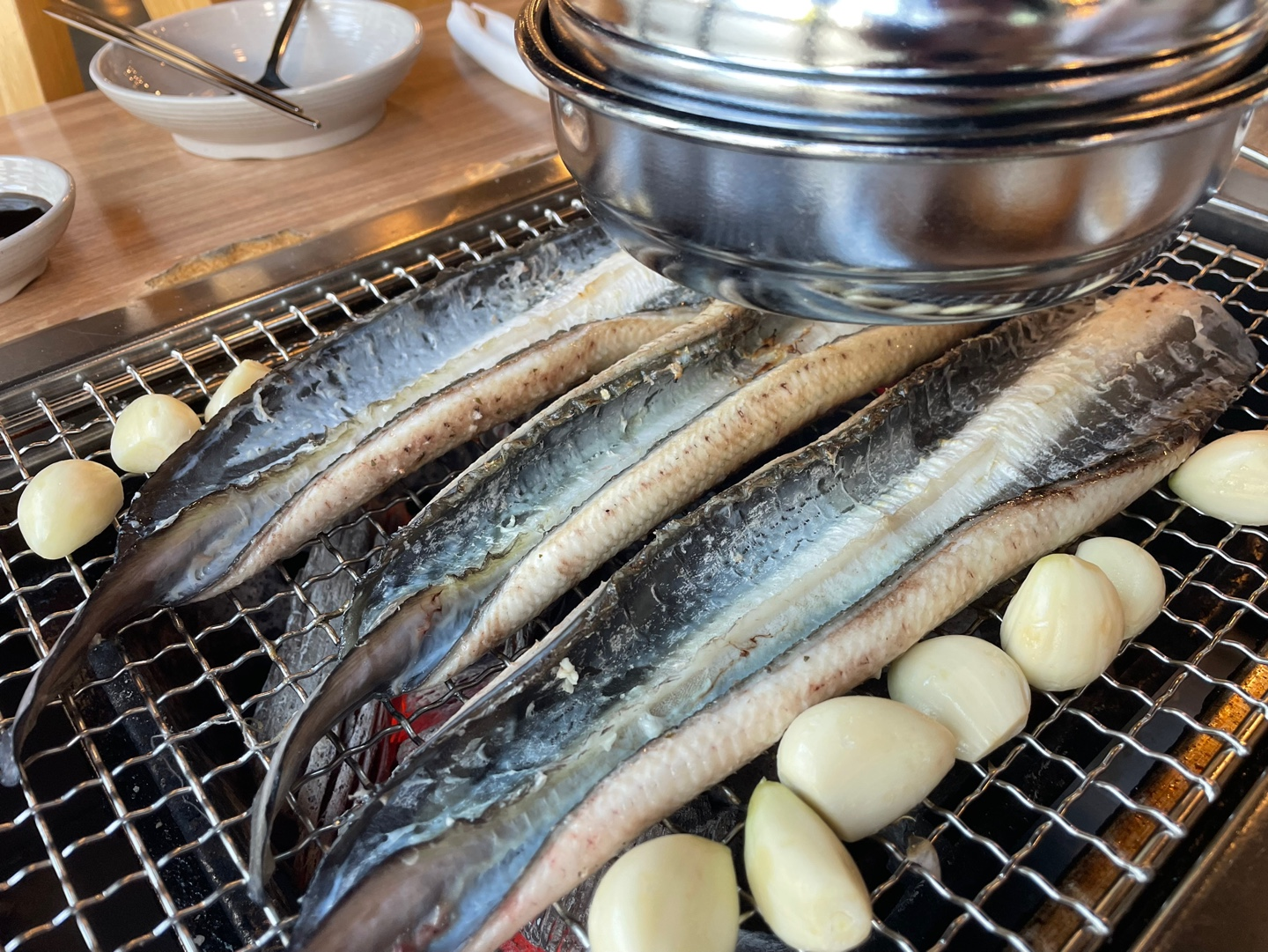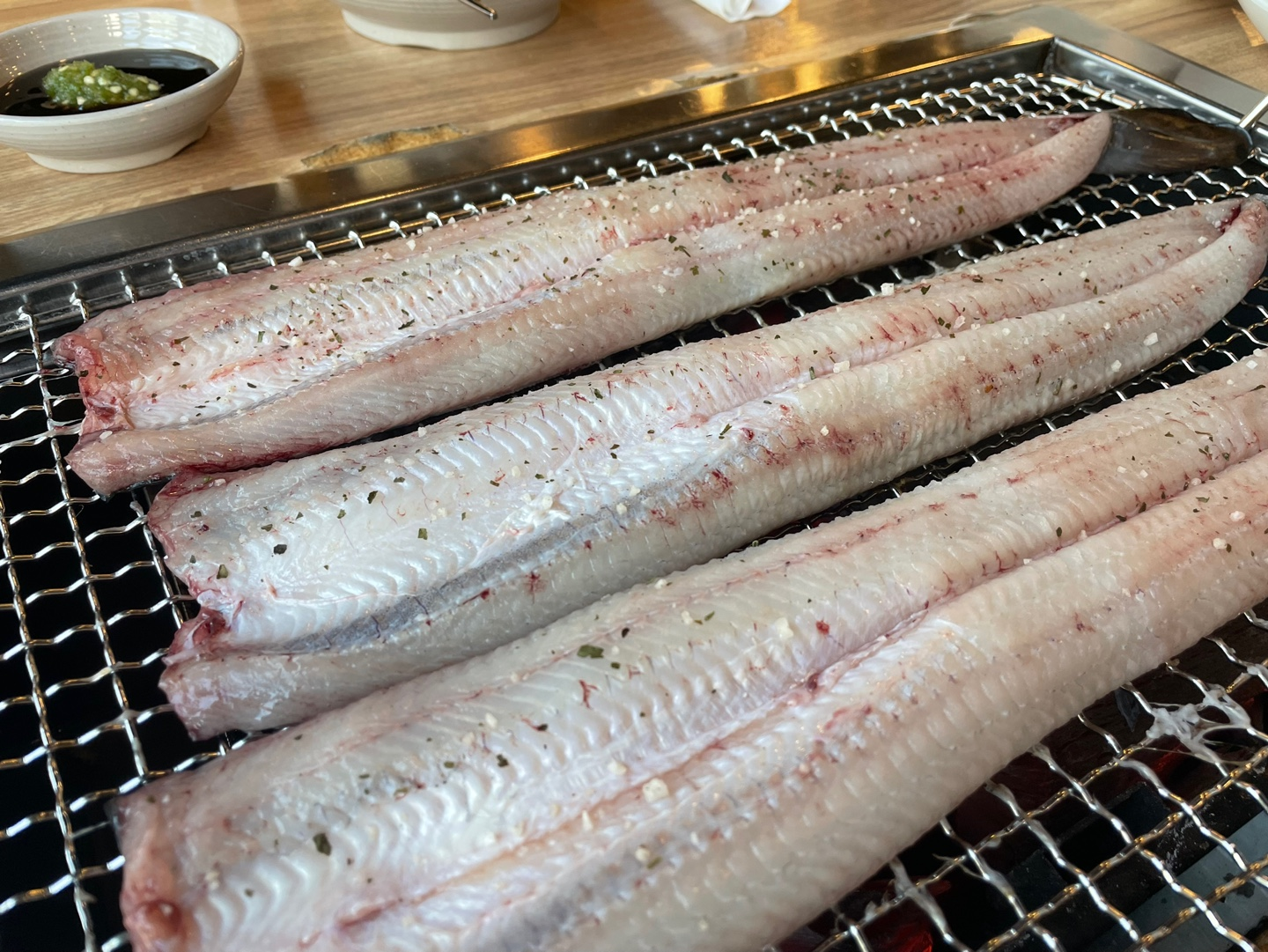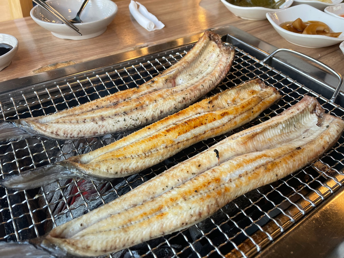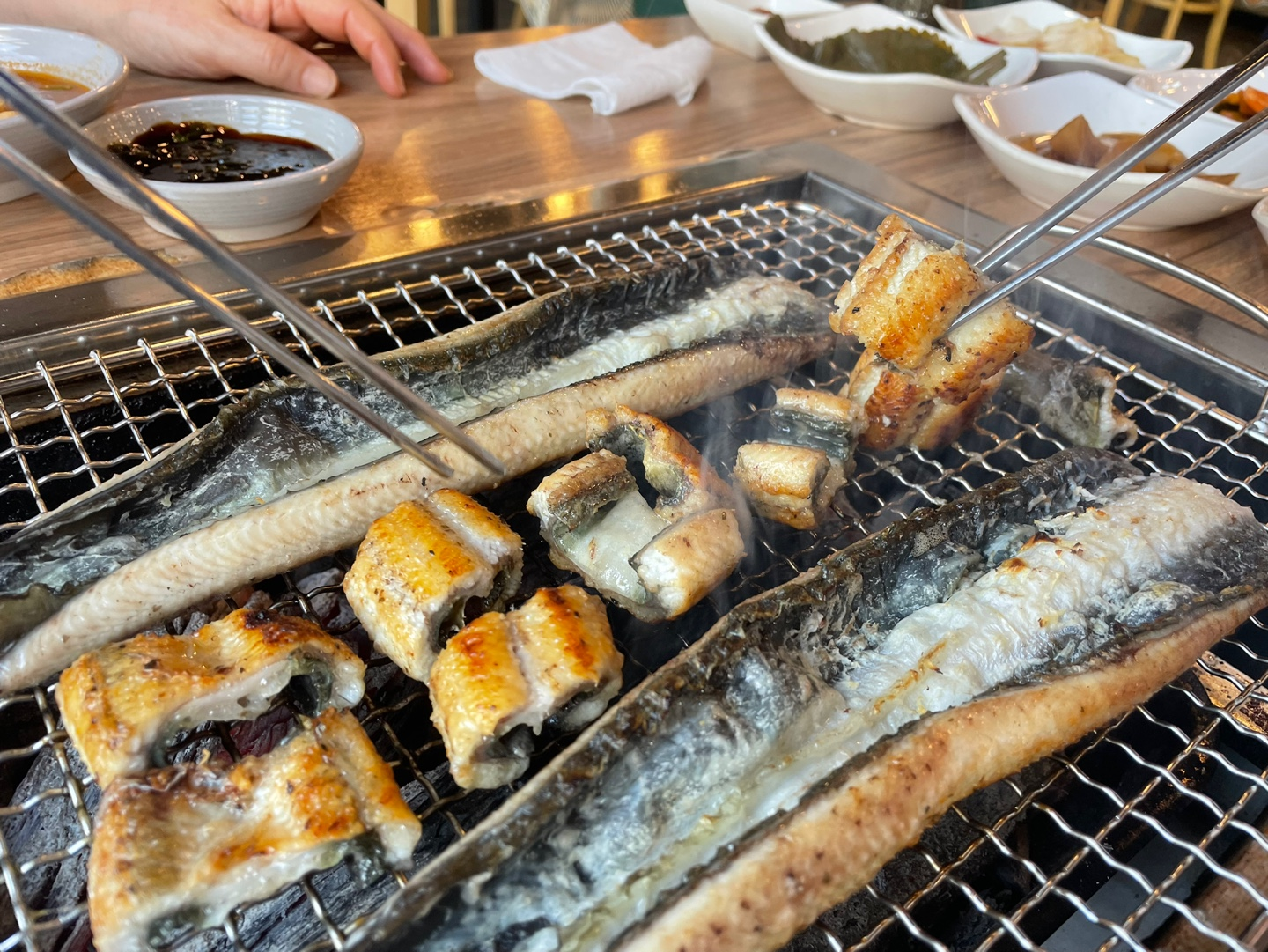 주문을 거의 마치자마자 장어 세 마리가 불판 위에 올려졌어요.