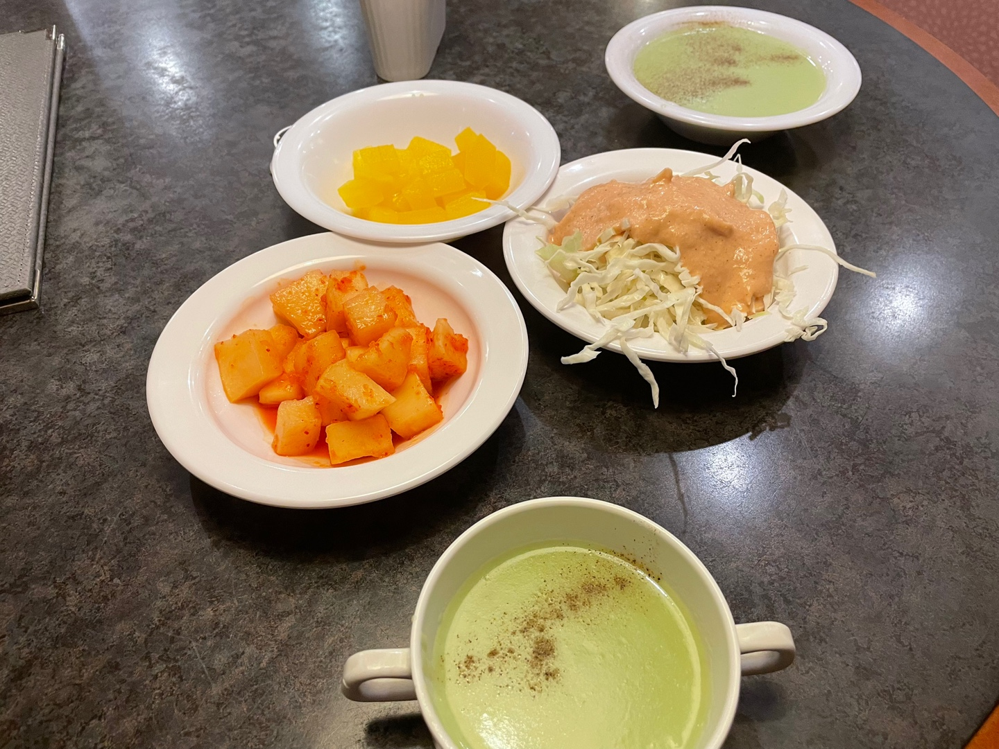 주문을 완료하고 셀프바에서 샐러드, 수프, 밑반찬 그리고 음료수도 가져와봤어요!
