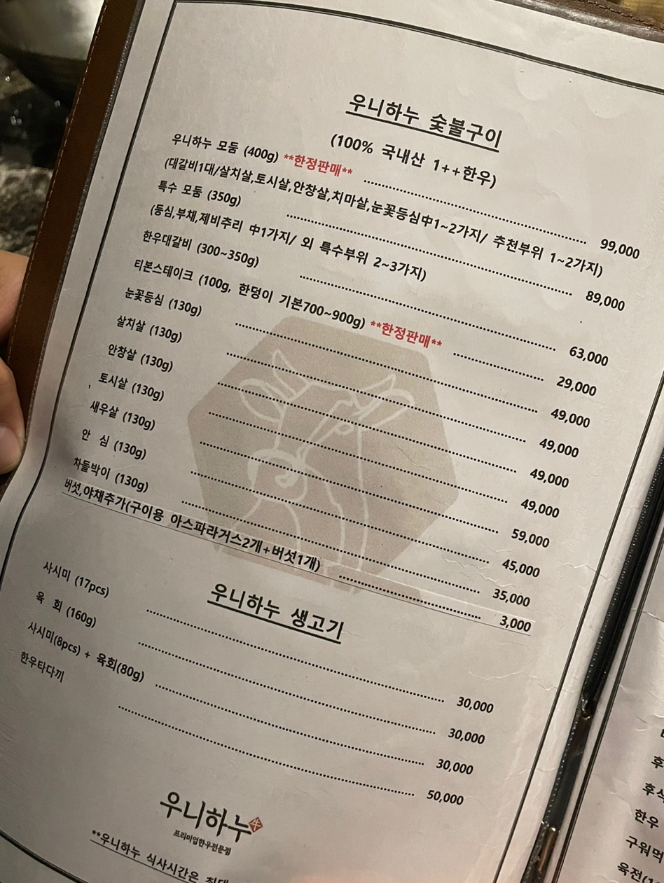고민하다가 동생의 주도로 우니하누 정식 세트 2인, 고기 단품 2인(안창살, 새우살)을 시켰어요.