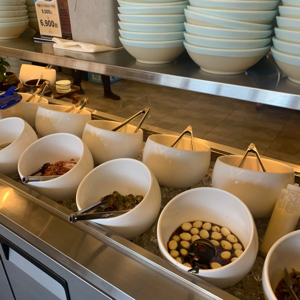 주문하면 원하는 반찬을 담을 수 있는 샐러드바가 있습니다. 샐러드바를 채우는 걸 목격했는데 위로 포장되어 굉장히 위생적이라는 느낌을 받았어요. 역시 기대 이상이에요. 계란프라이도 직접 해 먹을 수 있답니다.