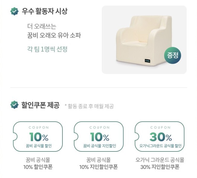 꿈비 공식몰 10% 할인쿠폰, 지인 선물 10% 할인쿠폰, 오가닉 그라운드 공식몰 30% 할인쿠폰을 매월 제공해 드린다고 합니다.