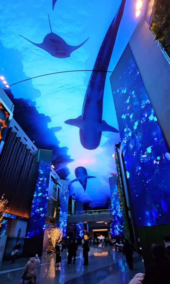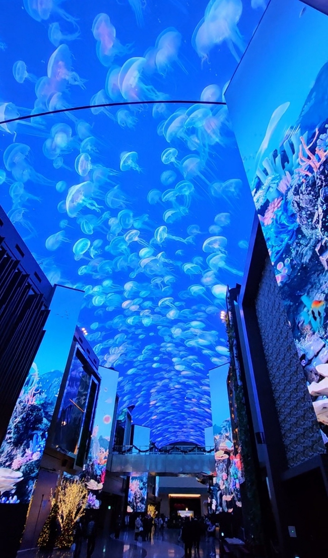 인스파이어리조트에 오시면 아무래도 오로라는 꼭 보고 가시는 것 같아요. 최장 LED에서 정시마다 펼쳐지는 고래가 나오는 화면 쇼가 진행됩니다.
