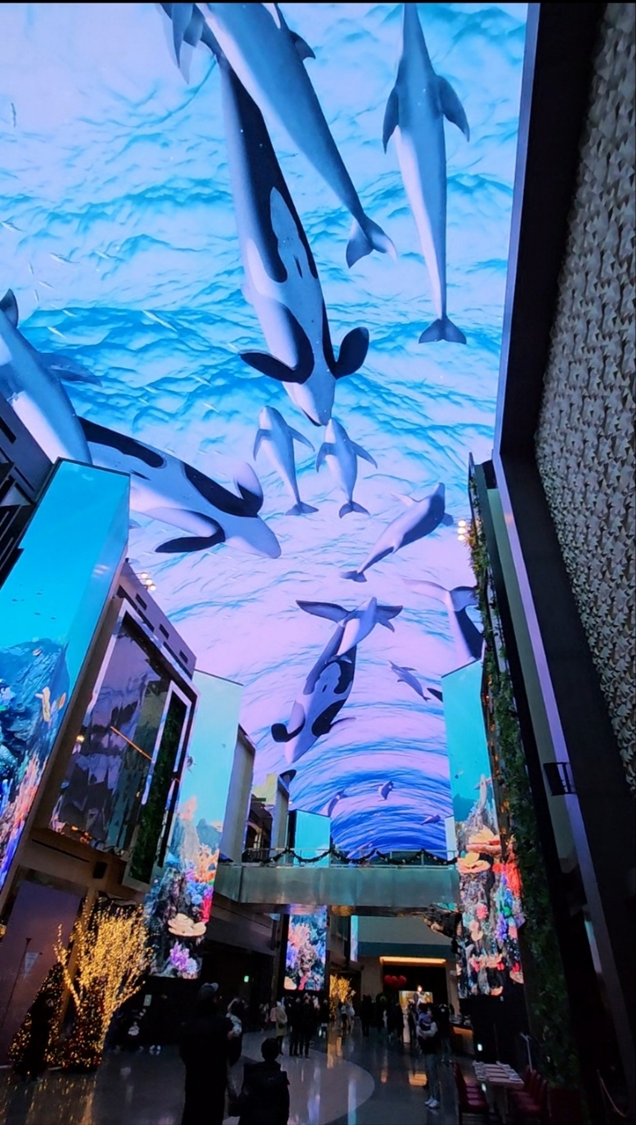 인스파이어리조트에 오시면 아무래도 오로라는 꼭 보고 가시는 것 같아요. 최장 LED에서 정시마다 펼쳐지는 고래가 나오는 화면 쇼가 진행됩니다.