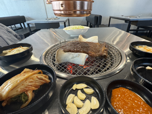 숯불에 치익 구워지며 군침이 돌기 시작해요.