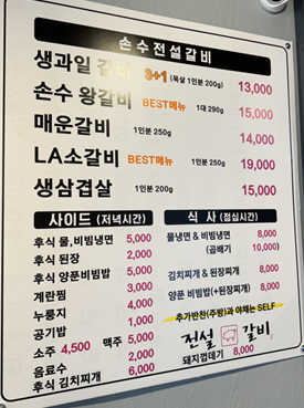 - 대표메뉴(개인적 추천): 손수왕갈비, LA소갈비, 된장찌개(후식/본품)