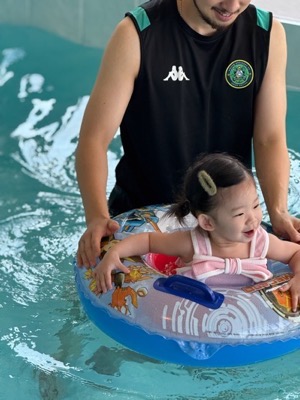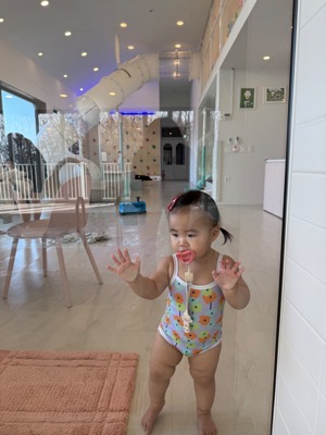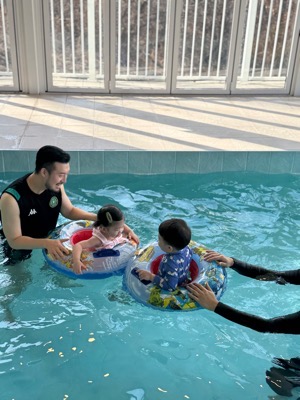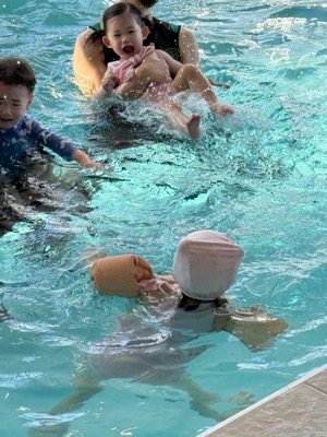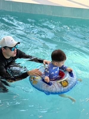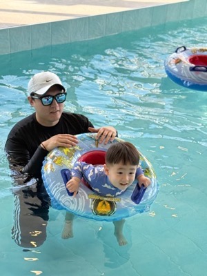 물 온도가 적절하게 유지되어서 오래 놀아도 춥지 않았어요! 영유아가 즐길 수 있는 미끄럼틀과 보행기 튜브는 덤!