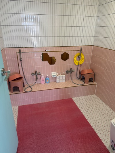1층에는 방이 세 개, 화장실이 두 개가 있었어요. 화장실 하나는 방 세 개 사이에 있고, 나머지 화장실은 온수풀과 바로 붙어있어서 수영이 끝난 직후 바로 아기를 씻길 수 있어요.