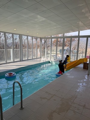 이곳의 풀장은 단순한 수영장이 아니라, 넓고 따뜻한 온수풀이었어요! 아이들도 마음껏 물놀이를 즐길 수 있었고, 어른들도 편안하게 물속에서 힐링할 수 있었어요.