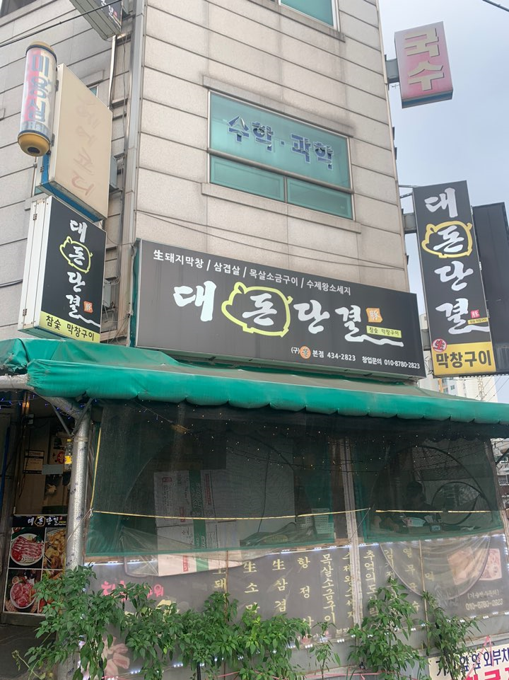 희미해진 수학과학 학원 밑에 자리 잡은 돼지 막창 집. 그 옆으로 보이는 미용실 표시. "응 여기 맛집이야 1"
