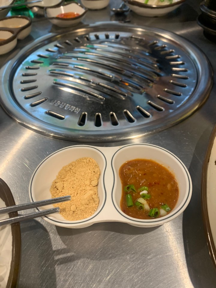 메인이 나오기 전에 기본 찬이 나와요. 콩가루와 막장 사진에는 없지만 칠리소스도 곁들여 나오고요. 김치찌개와 계란찜도 서비스! 로컬 맛집답게 가성비 빵빵!