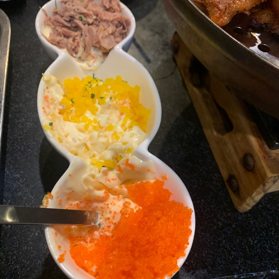 소스 하나에 4천 원이라는 점이 충격적이긴 하지만, 그래도 없으면 안 될 조합이에요. 마요 소스는 하나를 주문하면 아래와 같이 참치, 단무지 그리고 날치알이 섞여 나옵니다!