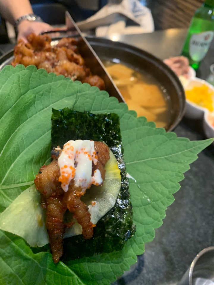 깻잎에 김을 얹힌 후, 마요 소스를 찍은 무뼈 닭발을 먹어주면 정말 꿀맛이에요. 냠냠! 이 맛이 계속 생각나요ㅠㅠ