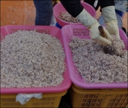 빠르게 휘휘 젓는 손목 스냅을 보며, 새우 외에 다른 어종이 섞여있지 않은지를 매의 눈으로 보셔야해요.